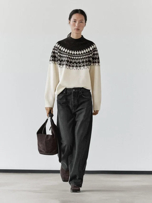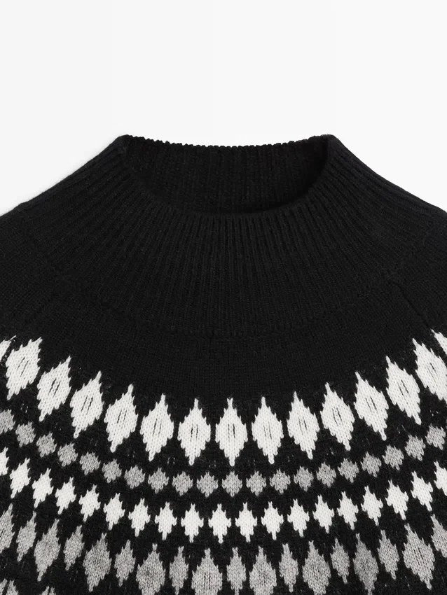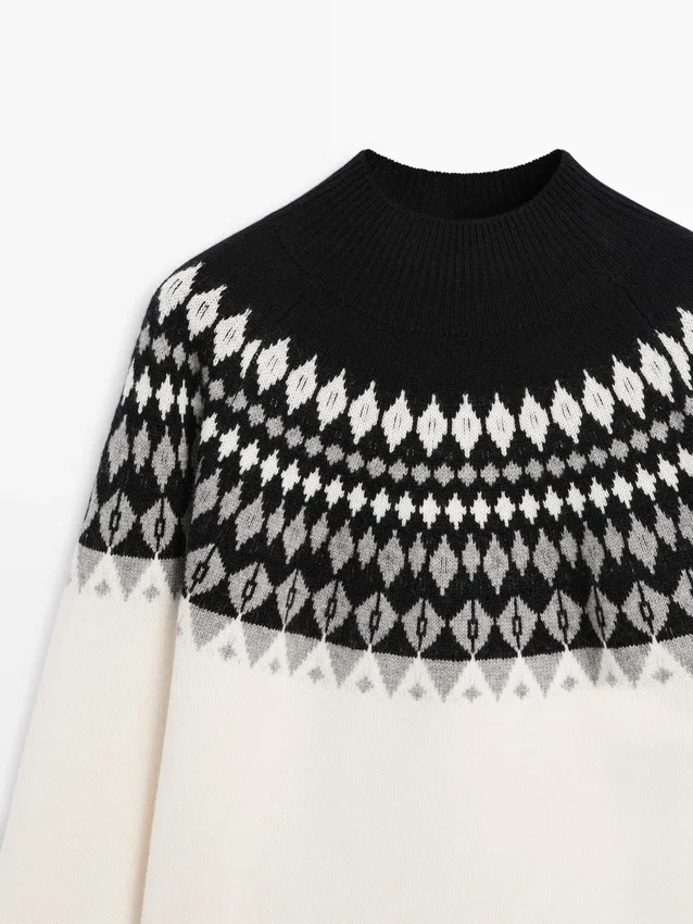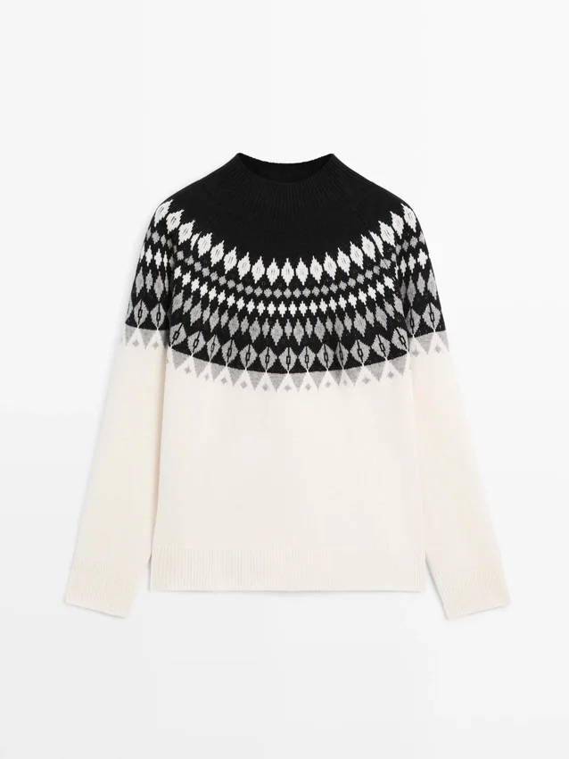 Maglione in maglia realizzato in tessuto misto lana. Girocollo alto. Maniche lunghe. Stampa jacquard. Bordi a costine.