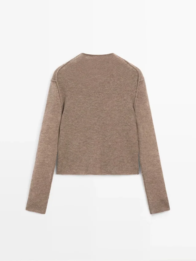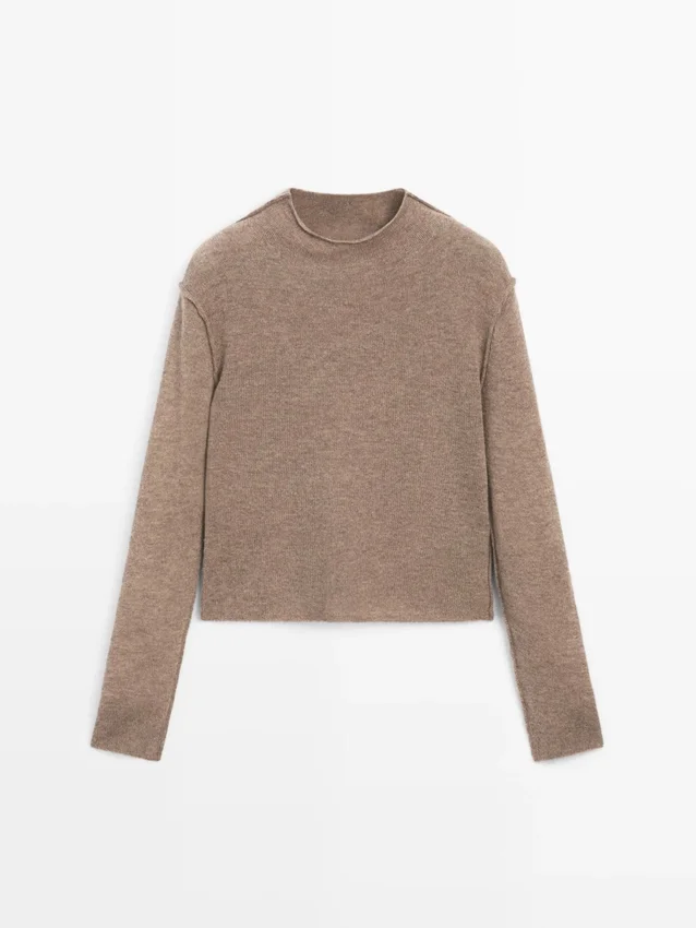 Maglione in maglia realizzato in tessuto misto lana. Finto collo alto. Maniche lunghe. Dettagli cuciture.