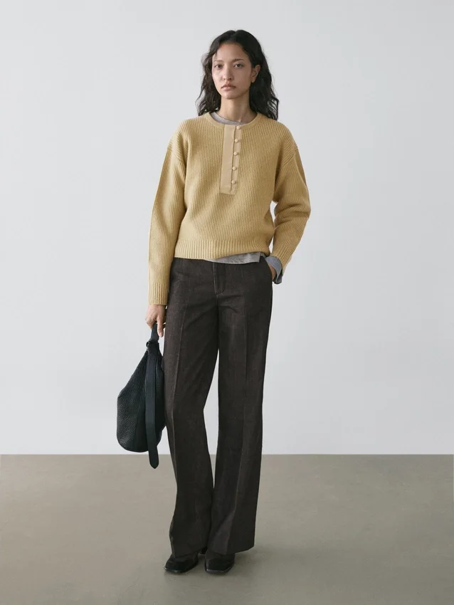 Maglione in maglia realizzato in tessuto misto lana. Collo con linguetta abbottonata. Girocollo. Maniche lunghe. Bordi a costine.