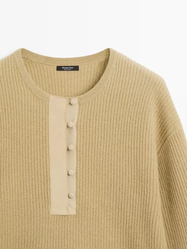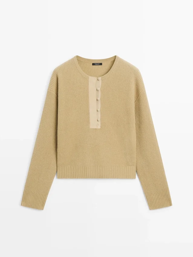 Maglione in maglia realizzato in tessuto misto lana. Collo con patta abbottonata. Girocollo. Maniche lunghe. Bordi a costine.