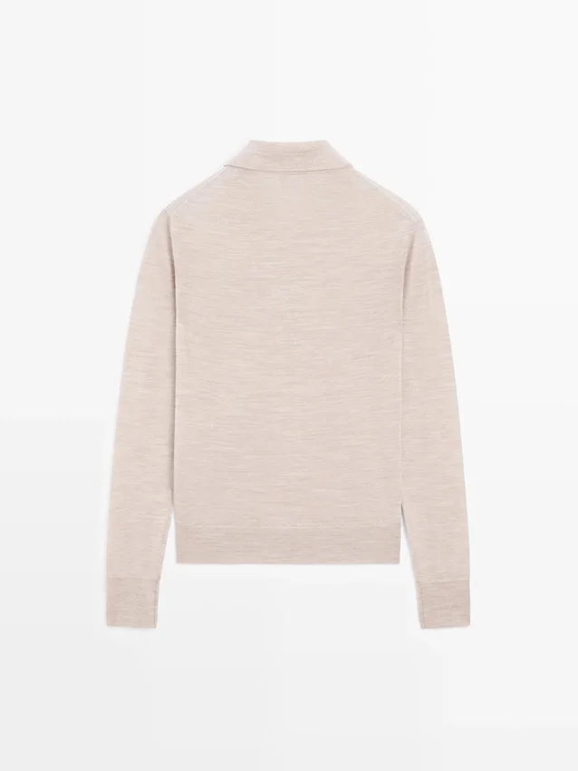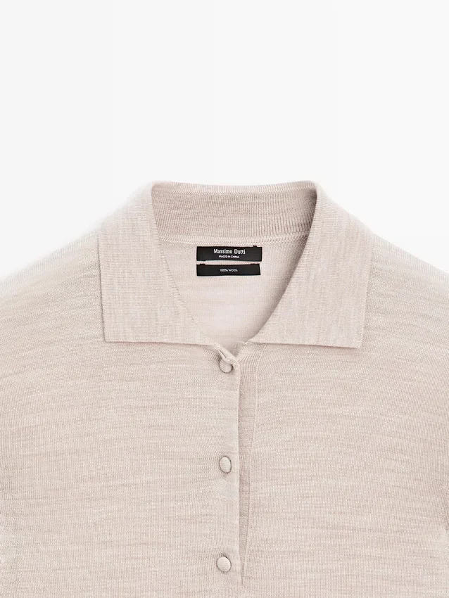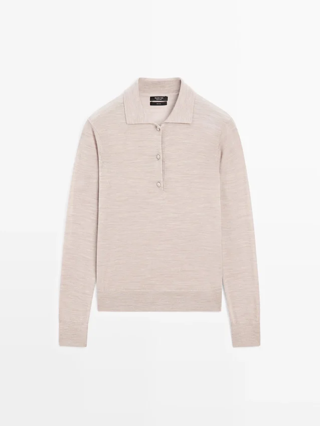 Maglione in lana. Maniche lunghe. Collo a Polo con chiusura a bottoni. Bordi a costine. Tessuto fine e leggero. Dettaglio bottoni ricoperti.
