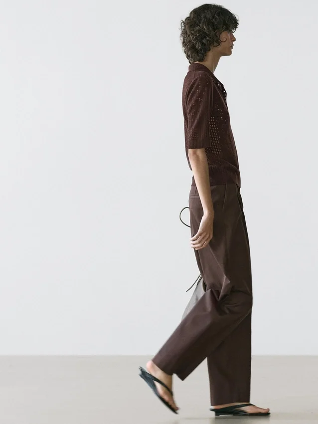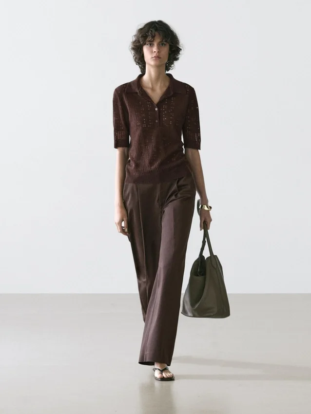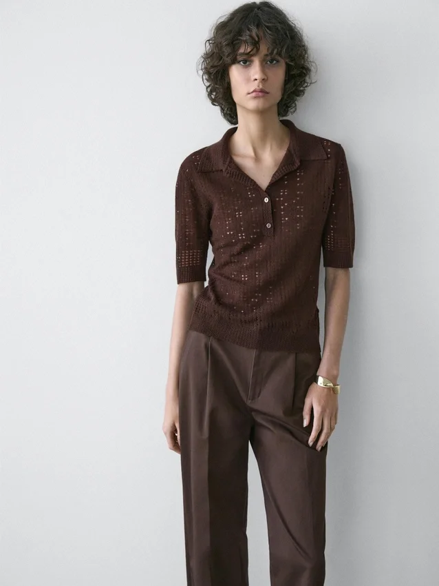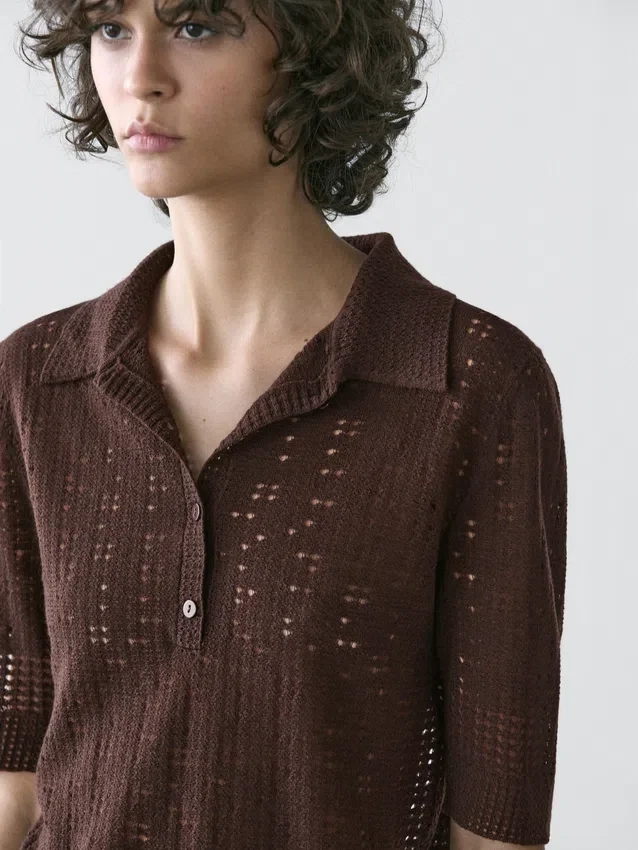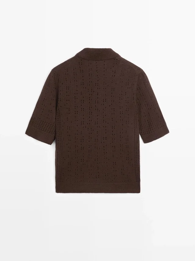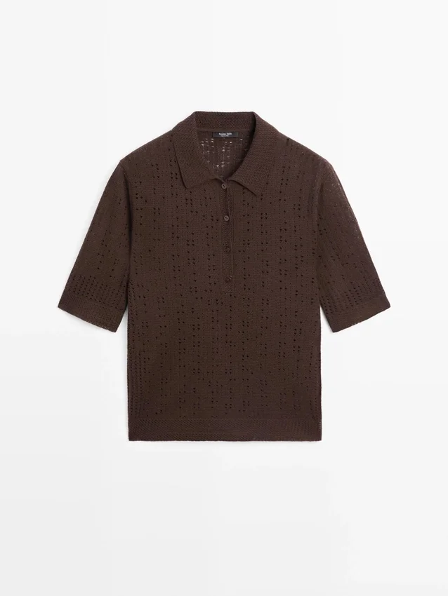Polo in maglia mista lana. Maniche corte. Collo a polo con chiusura a bottoni. Bordi a costine. Dettagli traforati.