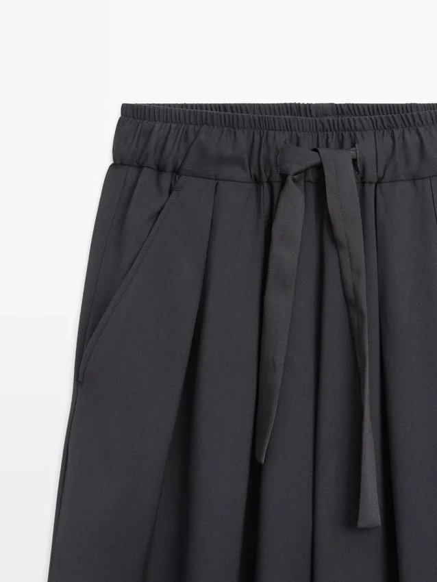 Pantaloni a gamba larga in tessuto fluido. Passante in vita. Dettaglio in vita elasticizzata. Due tasche laterali.Composizione