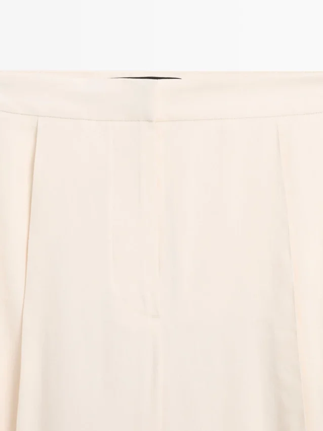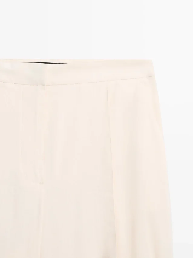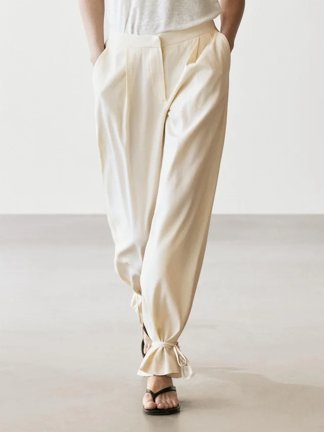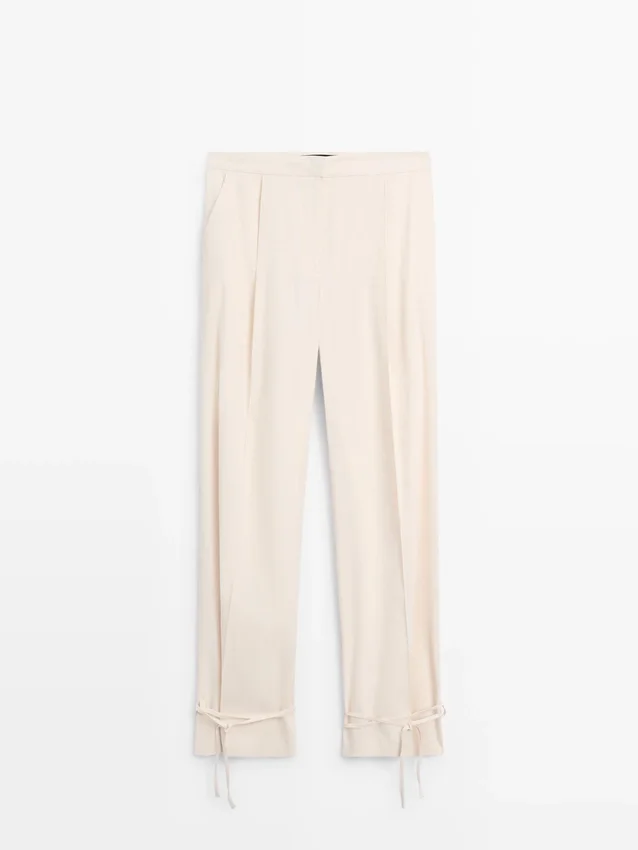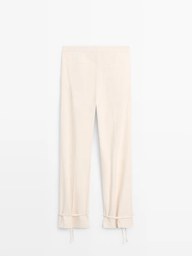 Pantaloni a zampa: questa vestibilità presenta una forma più ampia sulle cosce e una gamba più stretta verso la caviglia, una via di mezzo tra slim e regular. Pantaloni realizzati in tessuto fluido. Chiusura con zip nascosta da una patta, bottone interno. Due tasche laterali. Due tasche a filetto sul retro. Pinces sul davanti. Capo abbinato disponibile. Dettaglio con laccio sull’orlo.