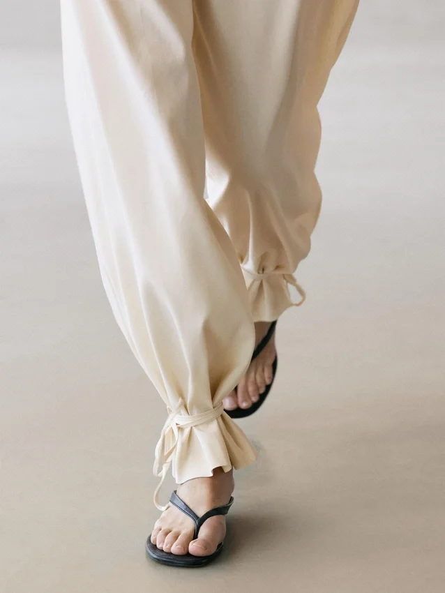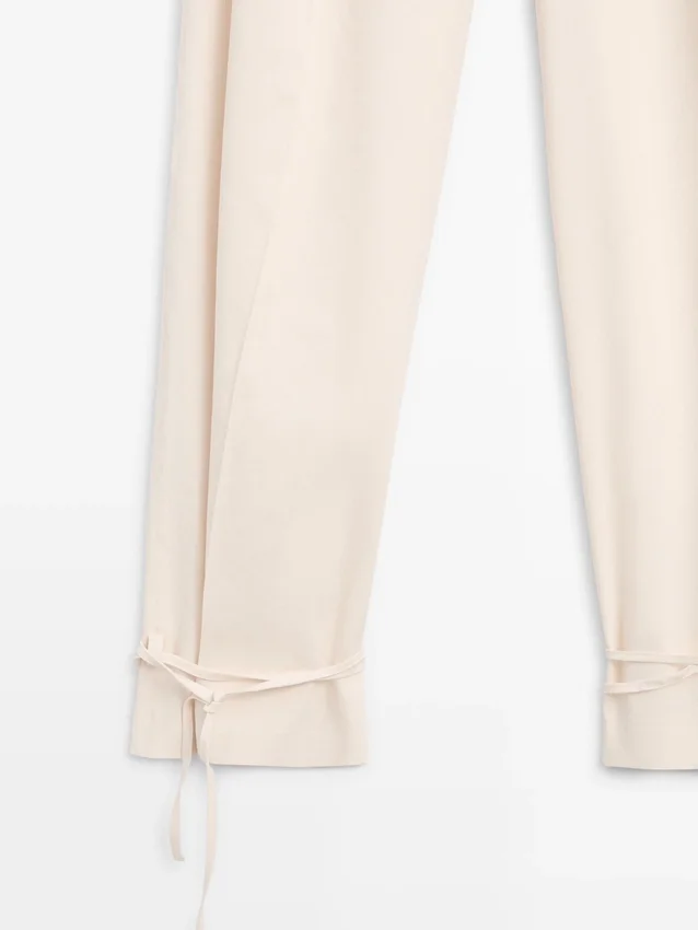 Pantaloni dal taglio a botte: questo modello presenta una forma più ampia sulle cosce e una gamba più stretta verso la caviglia, una vestibilità intermedia tra slim e regular. Pantaloni realizzati in tessuto fluido. Chiusura con zip nascosta da una patta, bottone interno. Due tasche laterali. Due tasche a filetto sul retro. Pinces sul davanti. Capo abbinato disponibile. Dettaglio con laccio sull’orlo.
