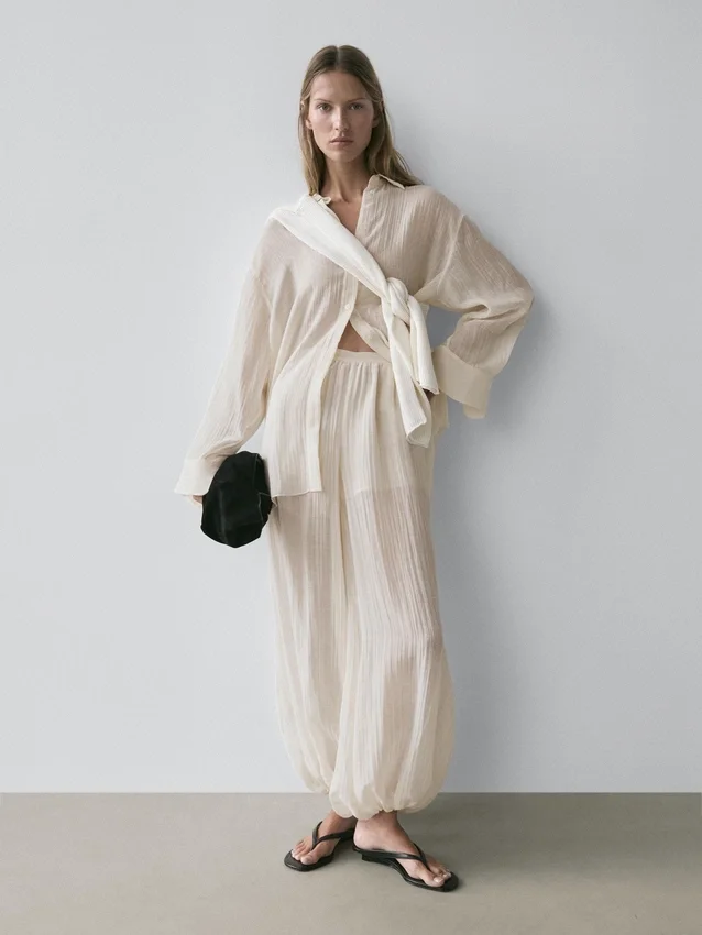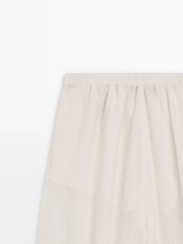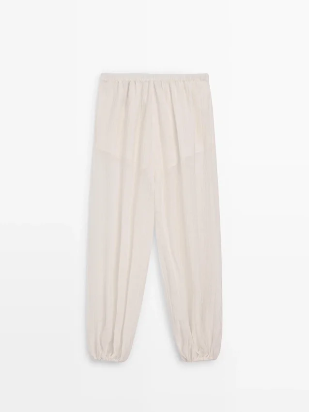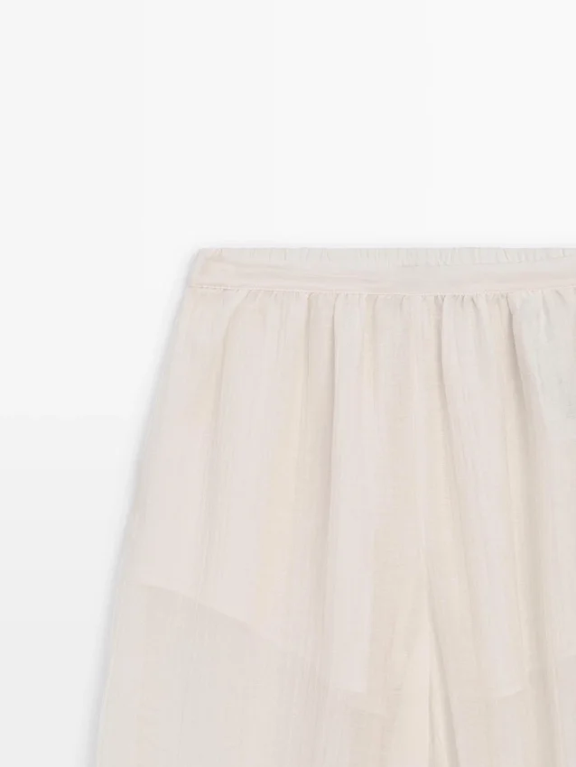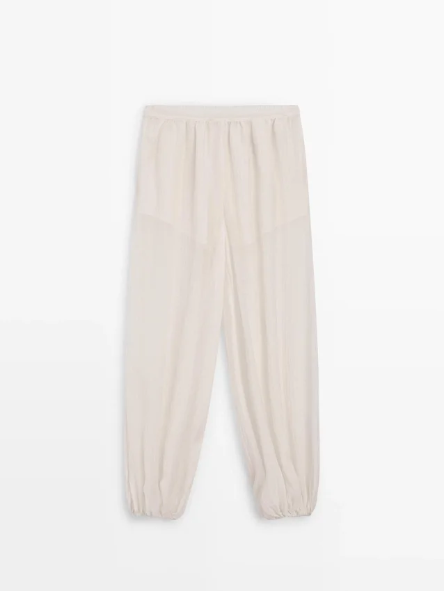 Pantaloni realizzati in tessuto fluido plissettato. Dettaglio in vita elasticizzata. Dettaglio in elastico sull’orlo. Tessuto semitrasparente. Capo abbinato disponibile.Composizione