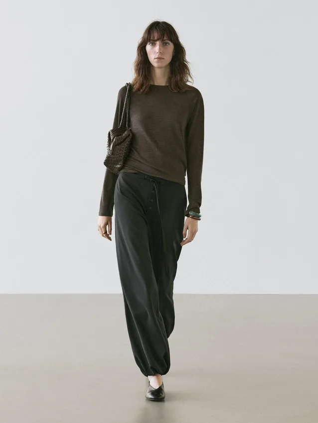 Pantaloni Sarouel: silhouette ampia, gamba larga e vestibilità alla caviglia. Chiusura frontale con bottoni. Passante in vita. Orlo elasticizzato regolabile. Due tasche laterali.