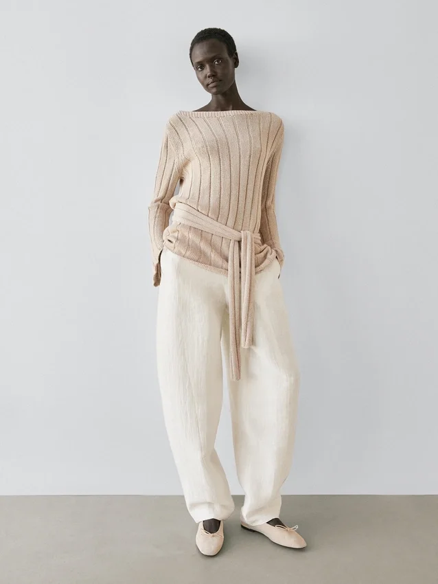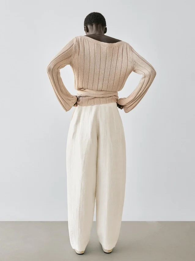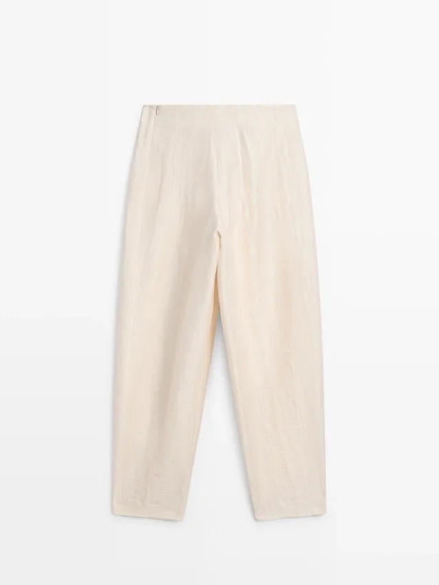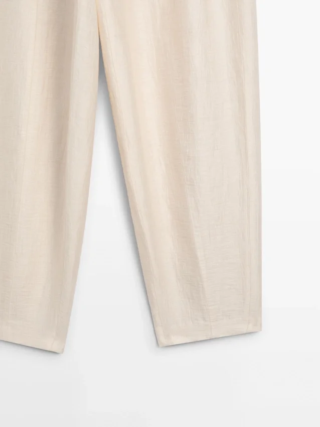 Pantaloni sarouel: silhouette ampia, gamba larga e vestibilità alla caviglia. Chiusura con cerniera laterale. Due tasche laterali. Una tasca a filetto sul retro. Capo abbinato disponibile.