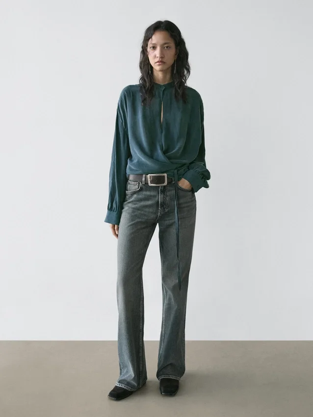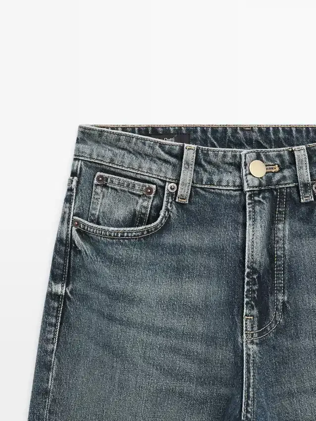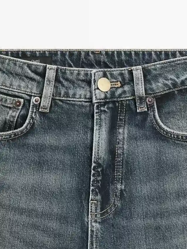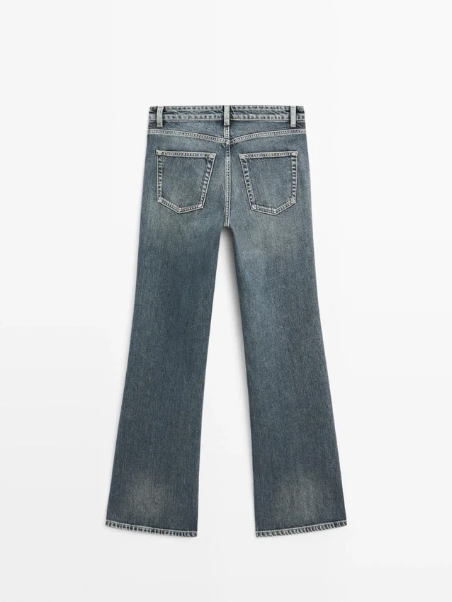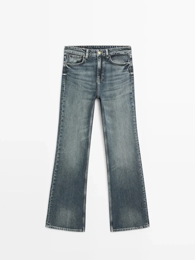 Jeans a zampa: questa vestibilità offre un taglio che si allarga gradualmente dal ginocchio alla caviglia, allungando visivamente le gambe. Vita media. Chiusura frontale con cerniera e bottone superiore. Design a cinque tasche.