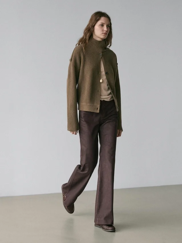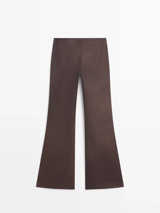 Pantaloni a zampa: questa vestibilità offre un taglio che si allarga gradualmente dal ginocchio alla caviglia, allungando visivamente le gambe. Chiusura con cerniera nascosta e abbottonatura. Pinces sul davanti e sul retro. Tessuto 100% cotone. Dettagli con finitura cerata ed effetto consumato.