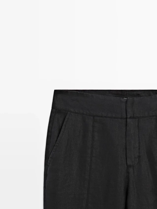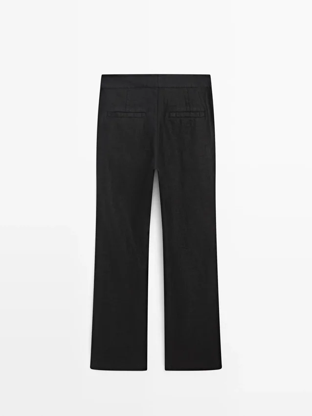 Pantaloni dal taglio svasato: leggermente svasati e lunghi fino alla caviglia. Chiusura con cerniera e ganci con bottone interno. Due tasche laterali. Due tasche a filetto sul retro. Dettaglio cucitura centrale. Realizzati in 100% lino.