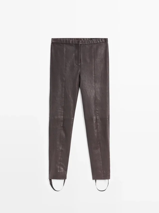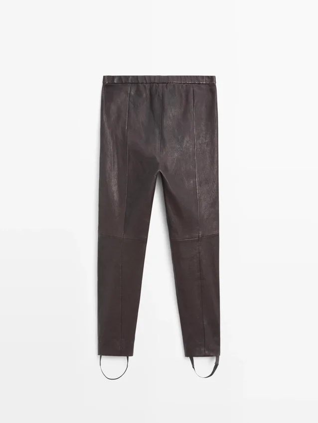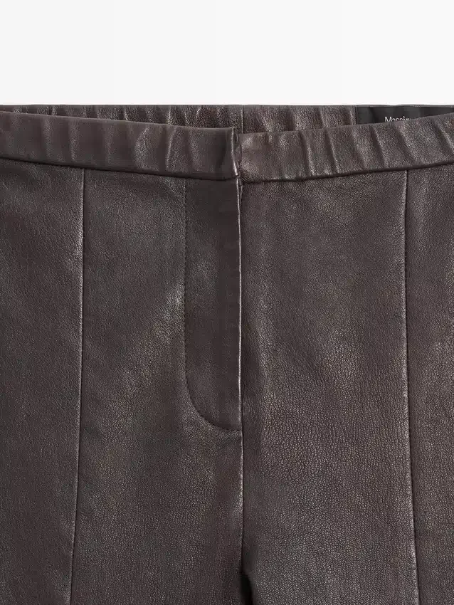 Pantaloni in pelle di montone con finitura in nappa. Chiusura con cerniera e ganci con bottone interno. Dettaglio elastico in vita. Dettaglio elastico sull’orlo. Dettagli cuciture. Suola in gomma rimovibile.