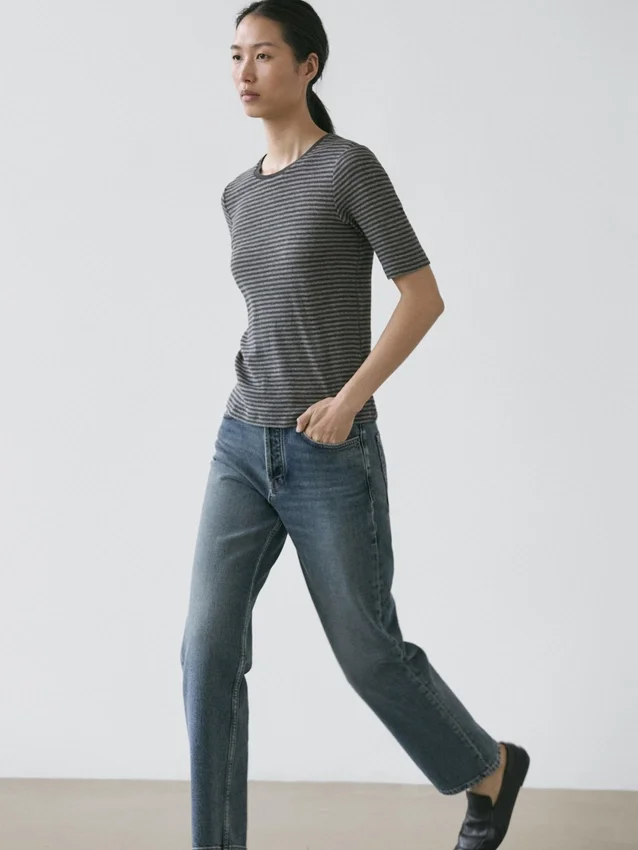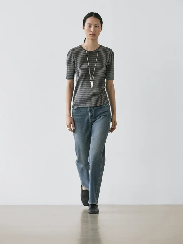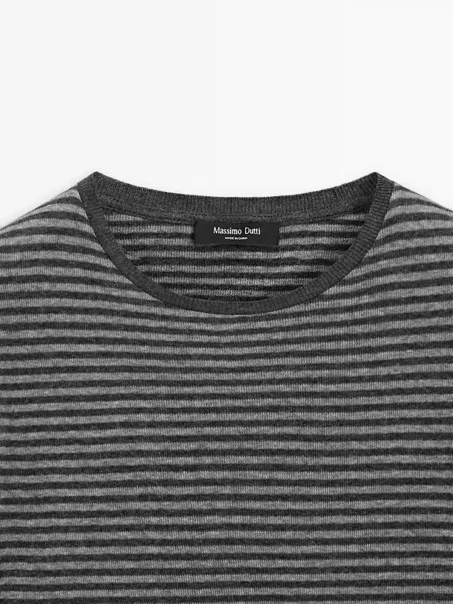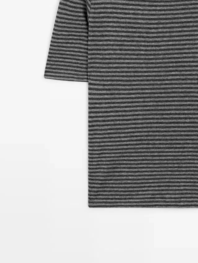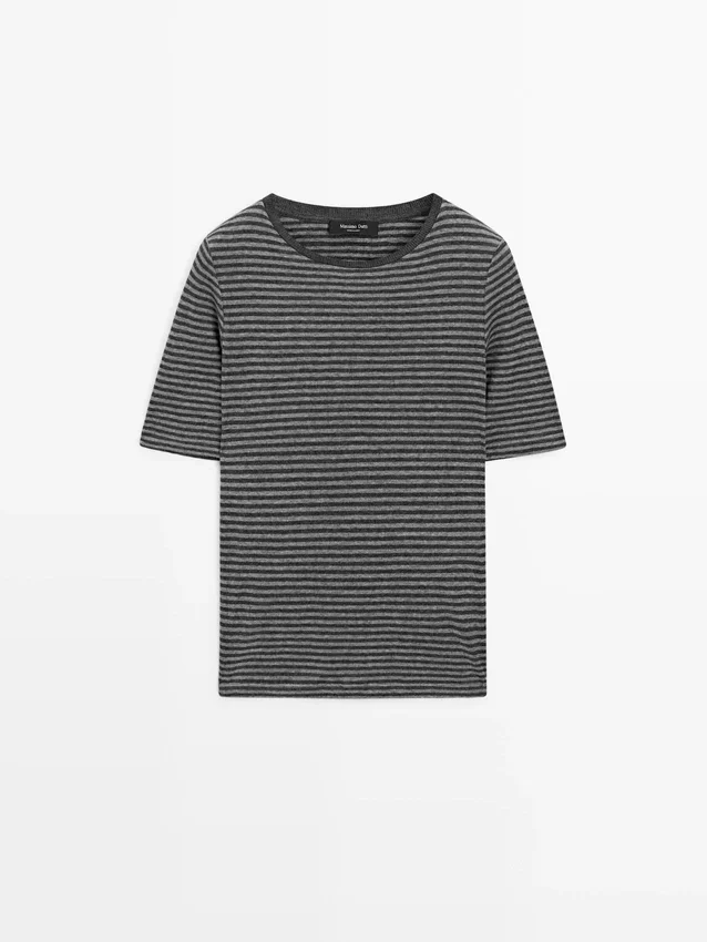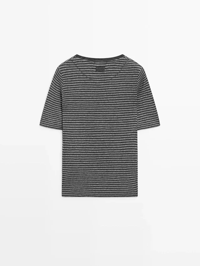 T-Shirt in maglia realizzata in tessuto misto cotone. Girocollo. Maniche corte. Dettagli a righe.