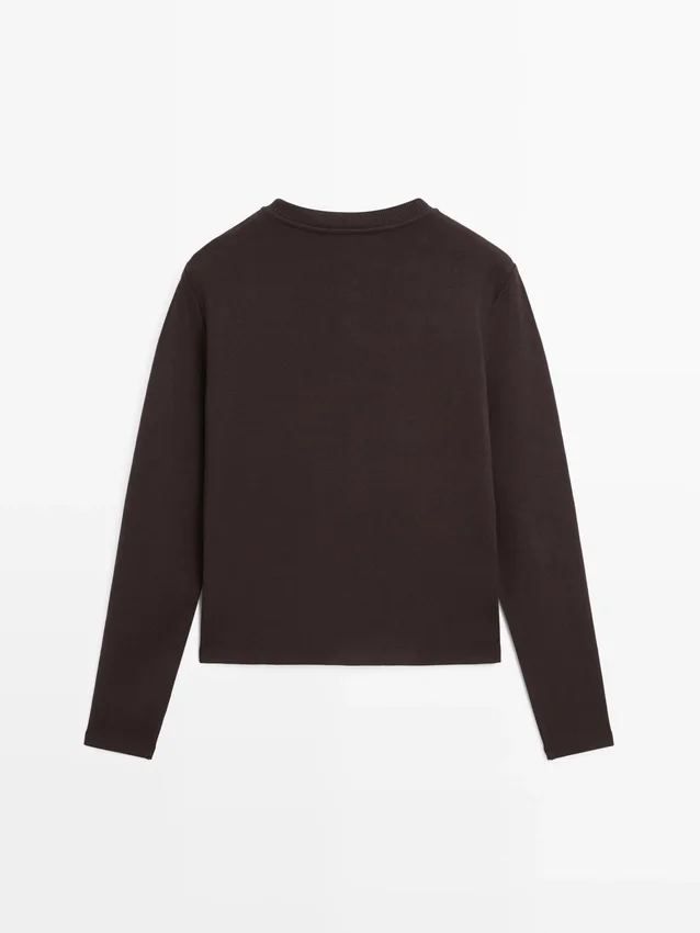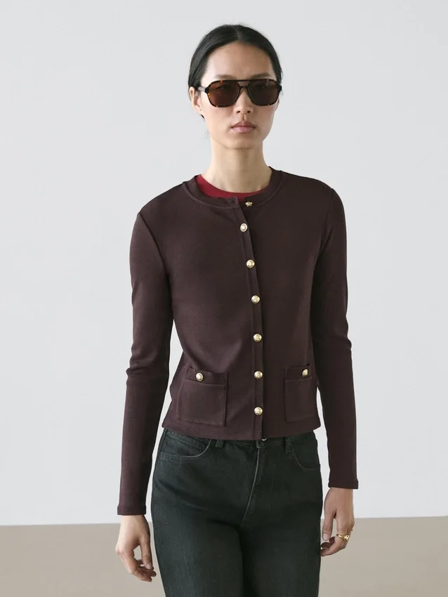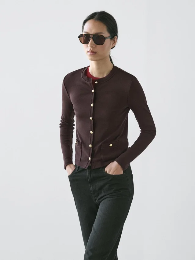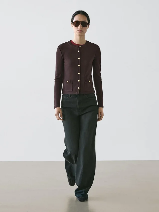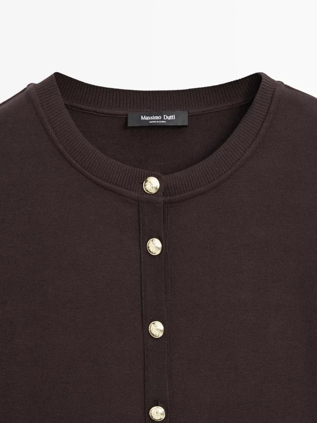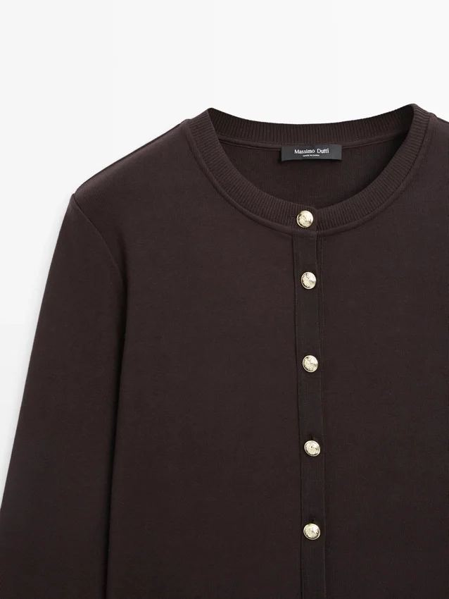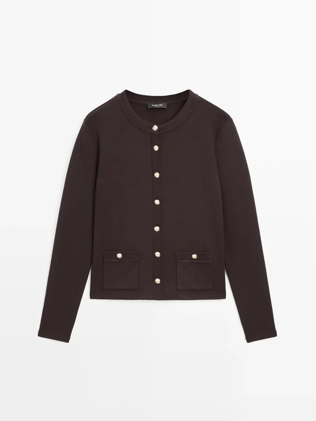 Cardigan. Girocollo. Maniche lunghe. Eleganti bottoni in strass color oro. Due tasche con patta e bottoni.