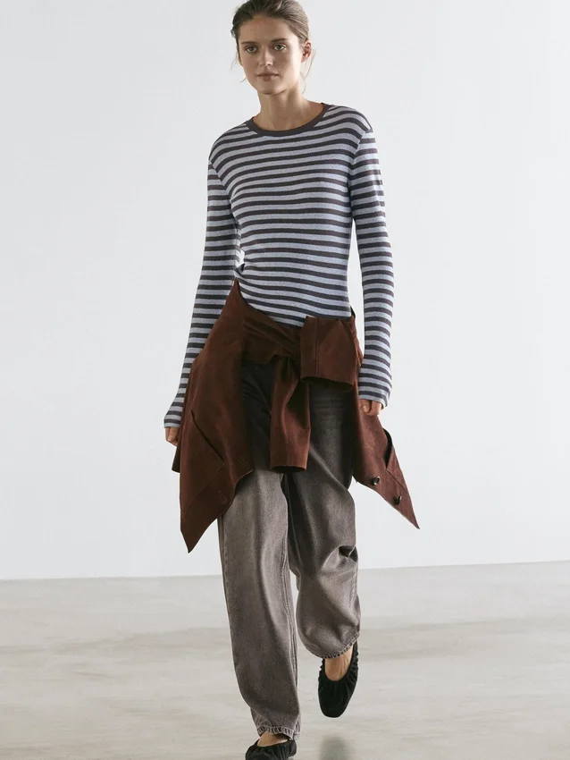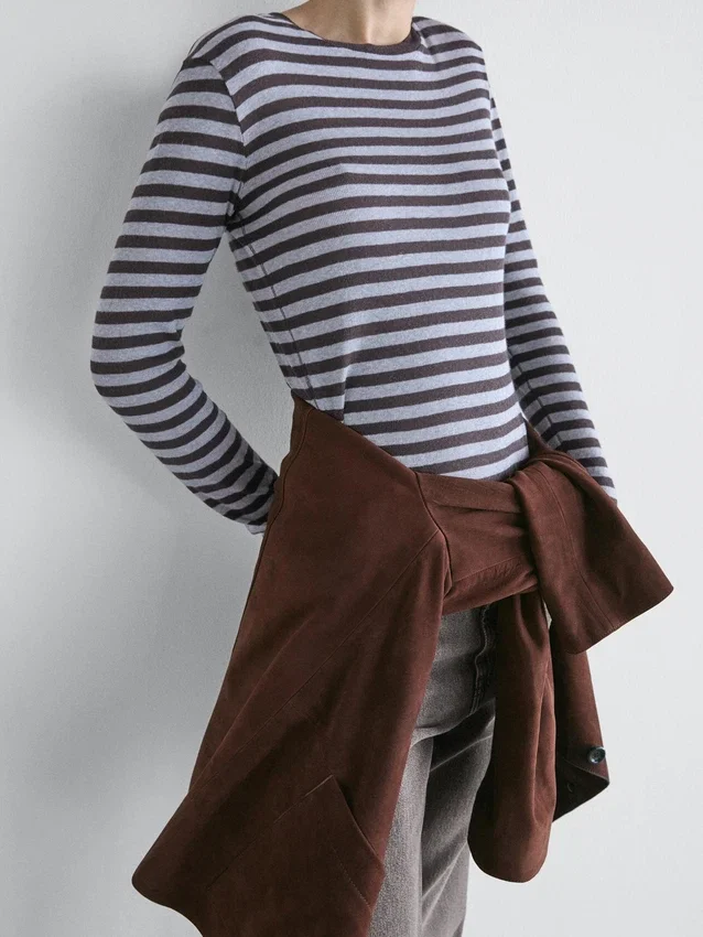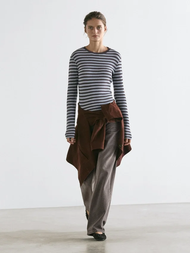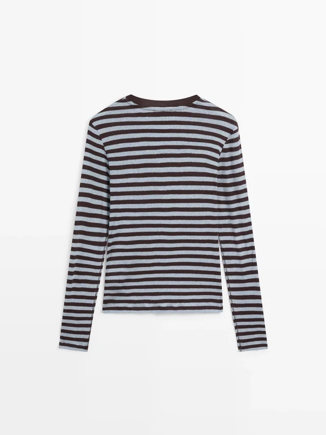 T-Shirt in misto cotone. Girocollo. Maniche lunghe. Stampa a righe.