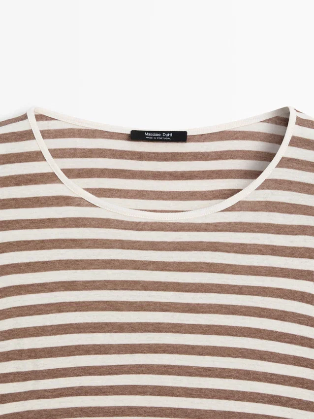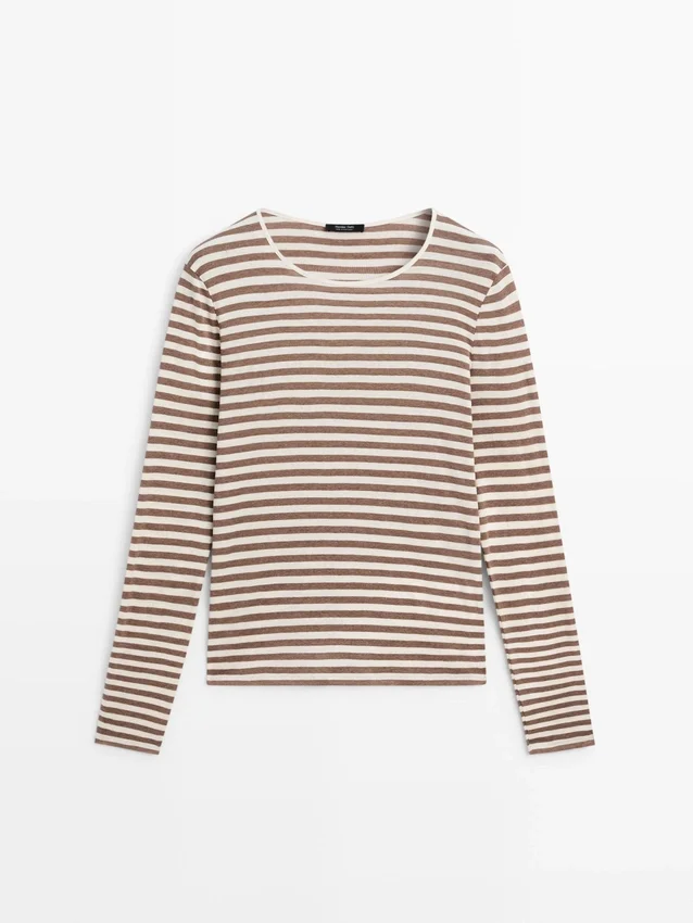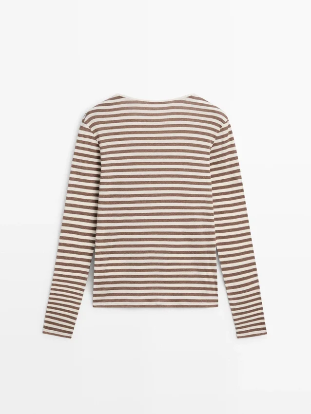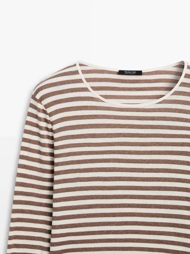 T-Shirt in cotone. Girocollo. Maniche lunghe. Dettagli a righe.