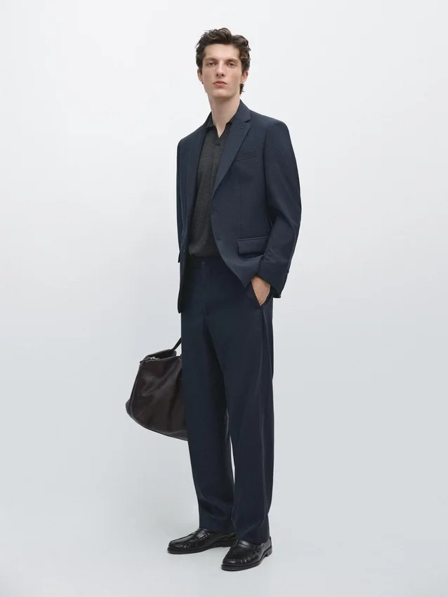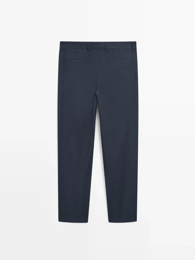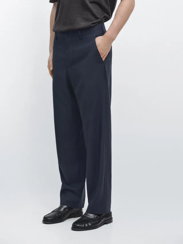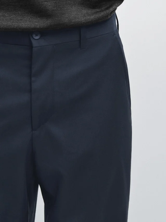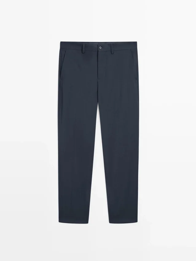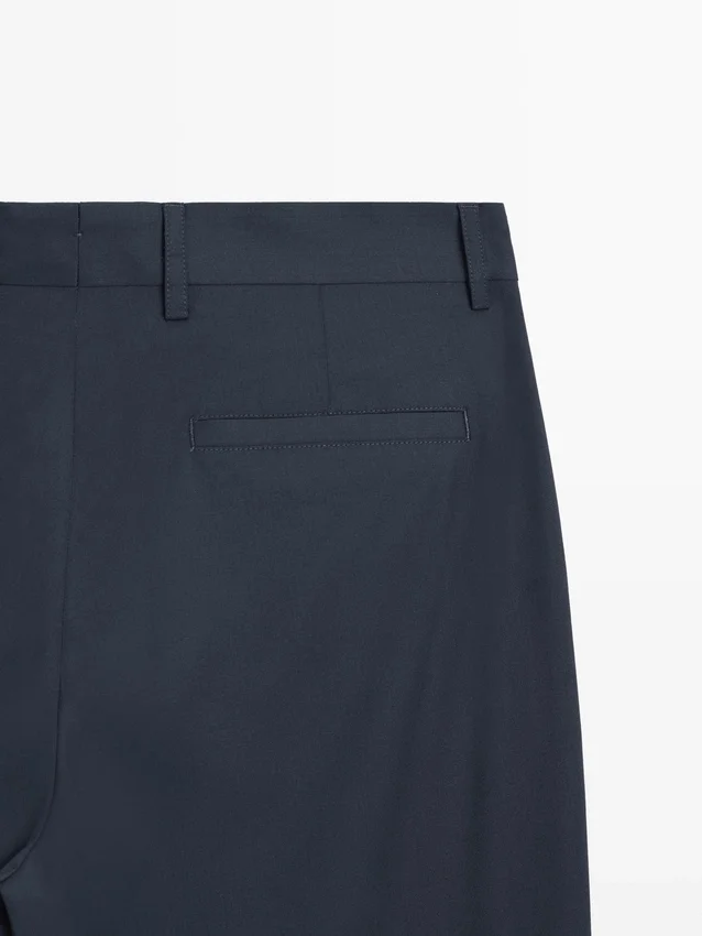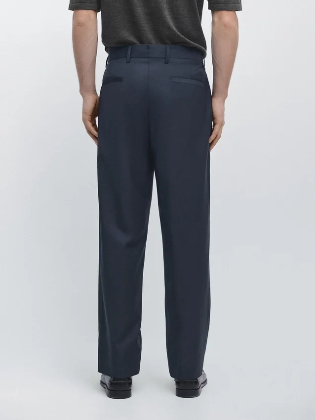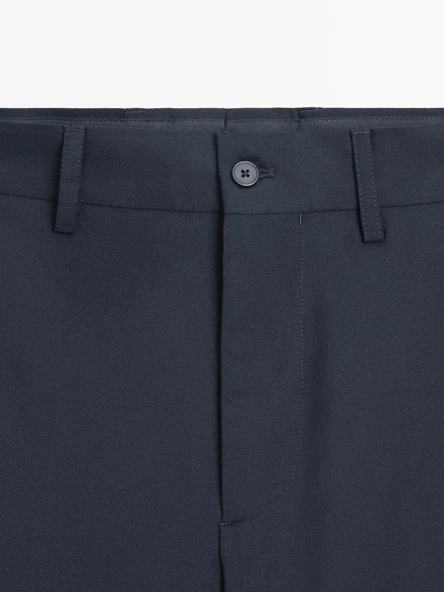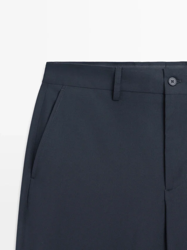 Pantaloni da completo realizzati in tessuto principale 100% lana. Cintura con passanti. Chiusura con cerniera nascosta da una patta, bottone e cinturino abbottonato. Due tasche laterali. Due tasche a filetto abbottonate sul retro. Cool Wool: tessuto leggero, traspirante e resistente alle pieghe. Questo capo fa parte di un abito da uomo.