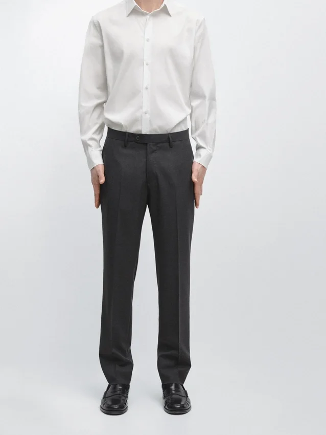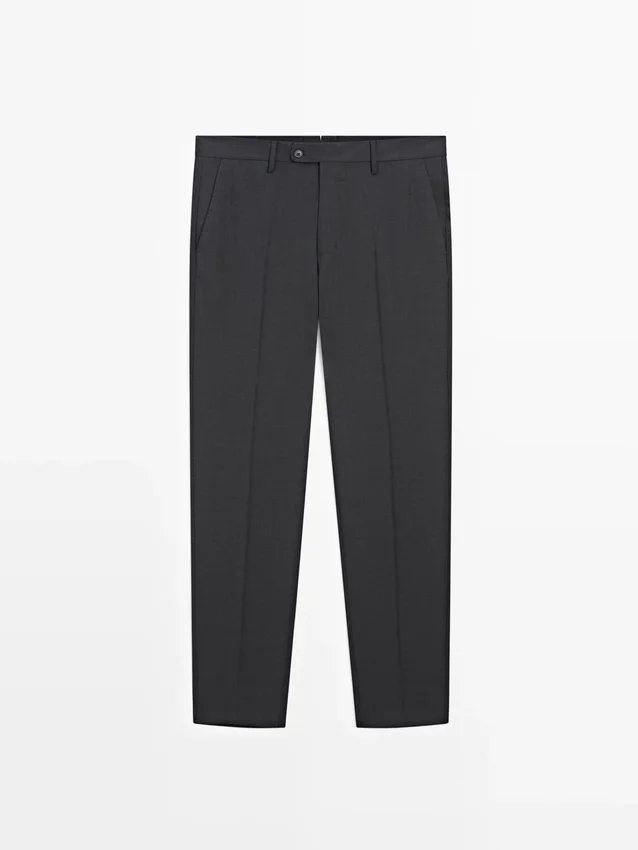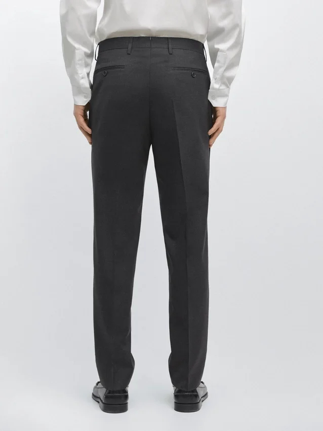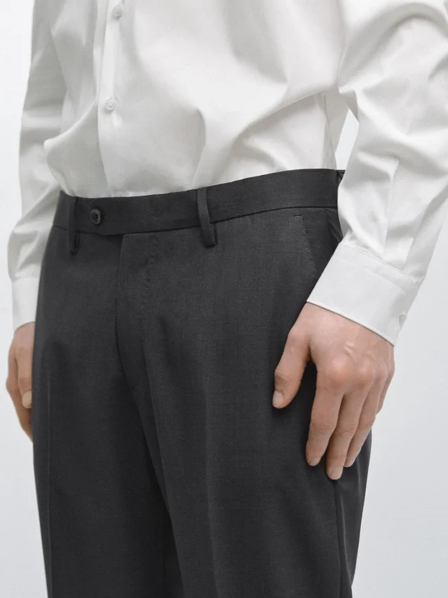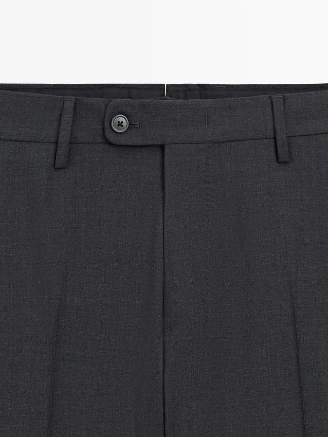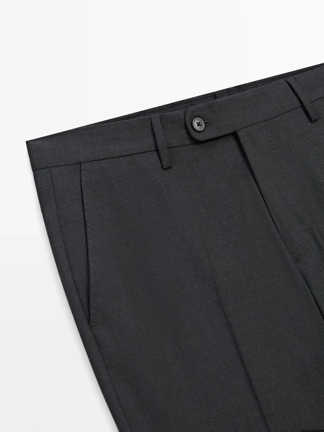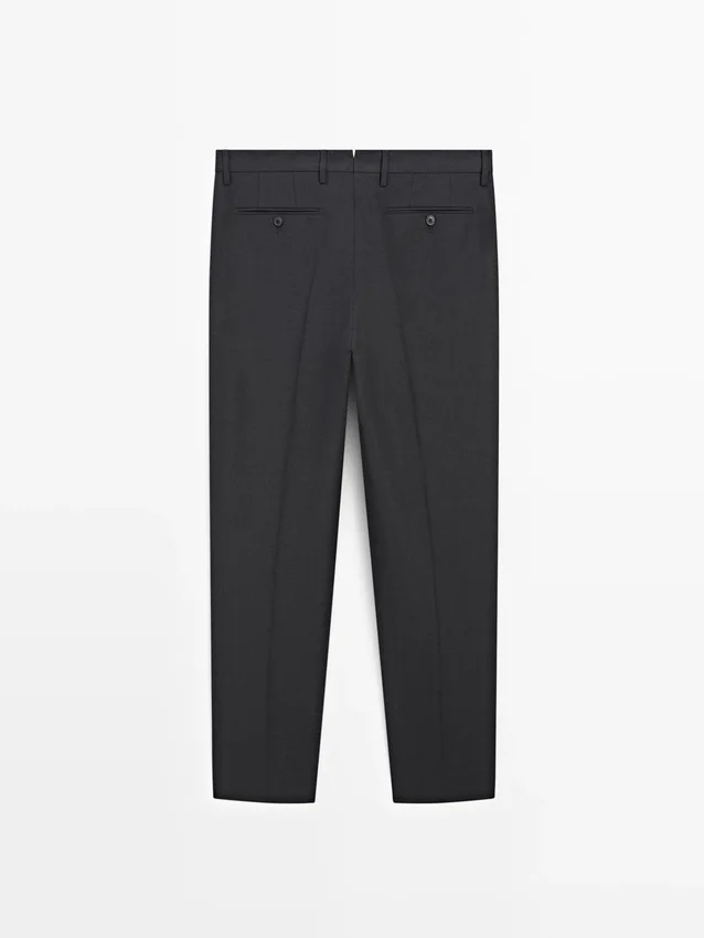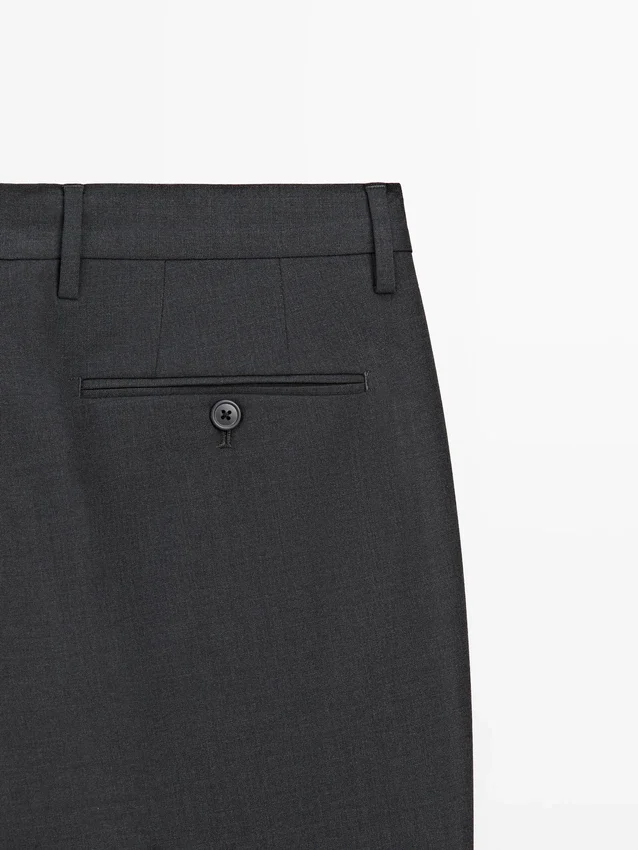 Pantaloni da completo realizzati in tessuto principale 100% lana. Cintura con passanti. Chiusura con cerniera nascosta da una patta, bottone e cinturino abbottonato. Due tasche laterali. Due tasche a filetto abbottonate sul retro. Lana fresca: tessuto leggero, traspirante e resistente alle pieghe..Composizione