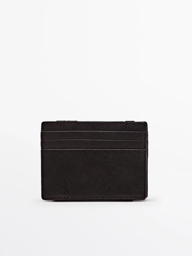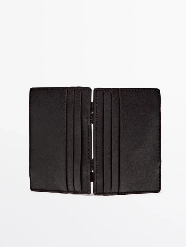Portafoglio orizzontale in pelle di vacchetta con finitura in pelle nappa. Diversi scomparti per carte. Chiusura “Magic”. Questo articolo è personalizzabile.