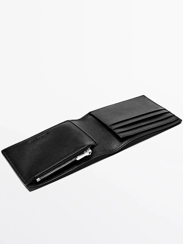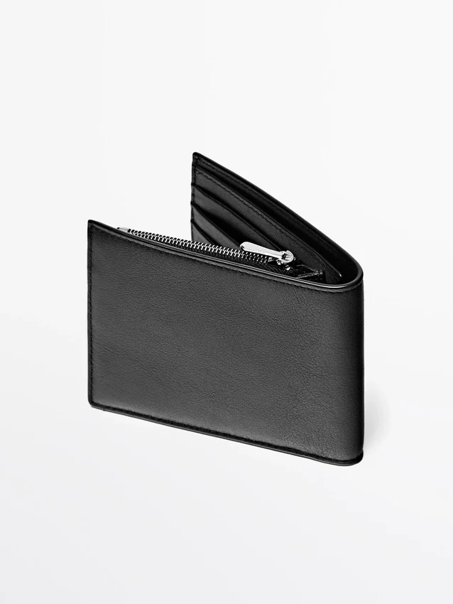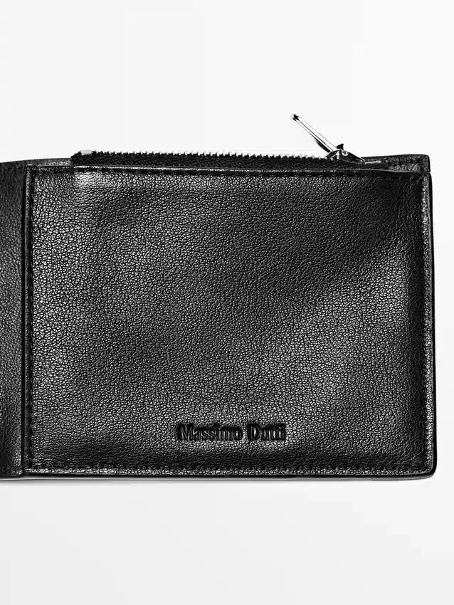 Portafoglio realizzato in pelle di vacchetta con finitura in nappa. Dispone di uno scomparto per banconote, scomparti per carte e un portamonete con chiusura a zip.