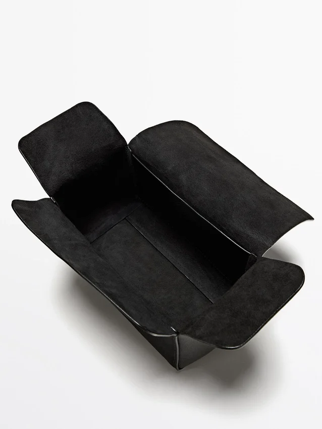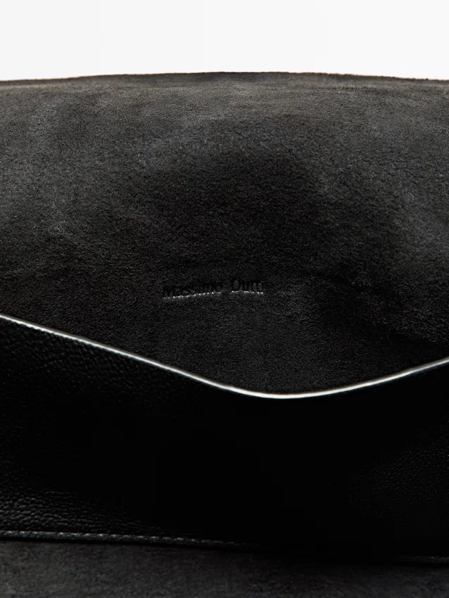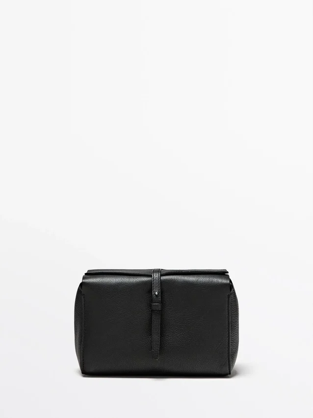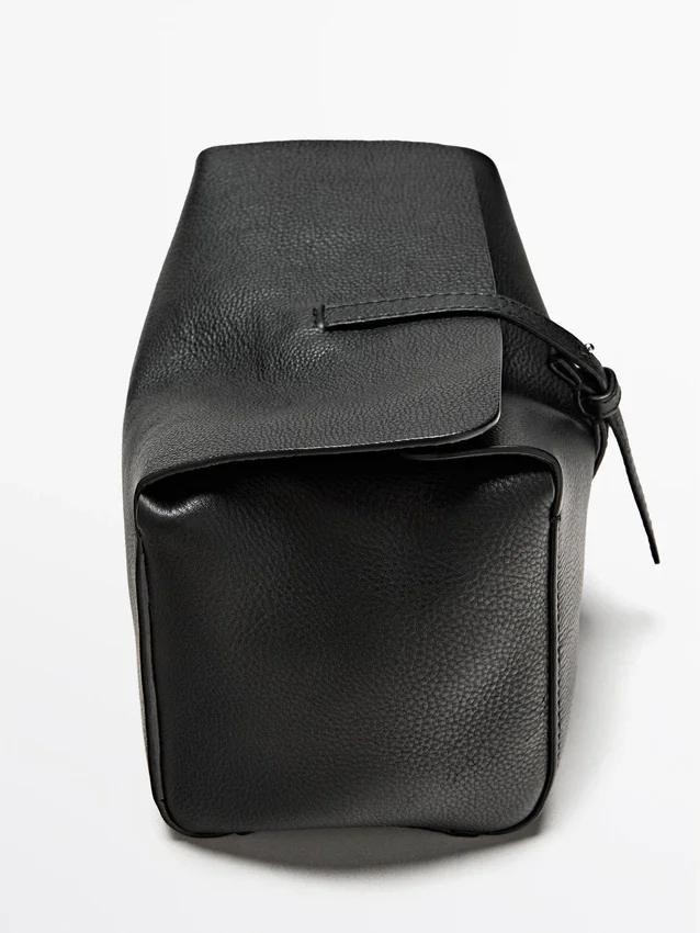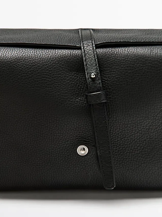 Borsa da toilette in pelle di vacchetta con finitura in pelle nappa. Chiusura a bottone a pressione nascosta.