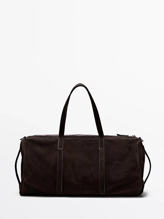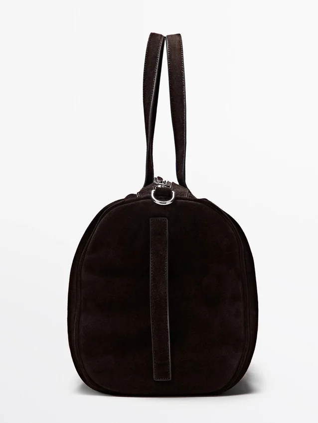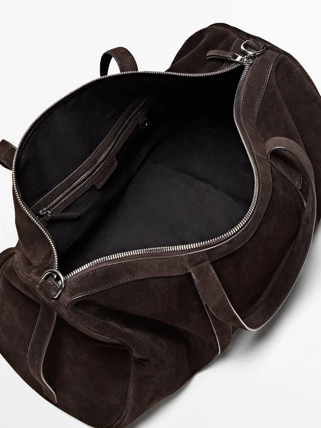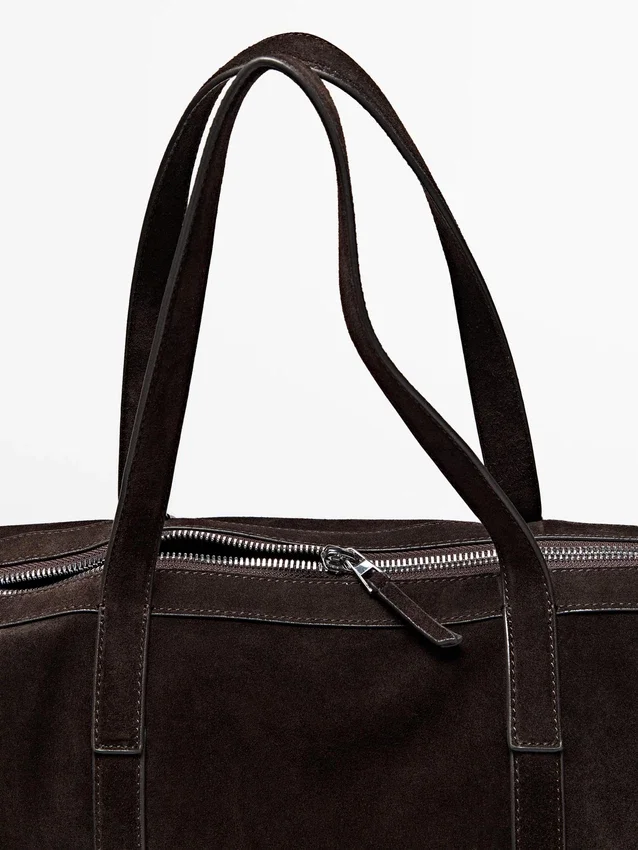Borsa realizzata in pelle bovina con finitura scamosciata. Tracolla regolabile e staccabile. Chiusura con cerniera a doppio cursore. Due manici. Fodera in cotone.