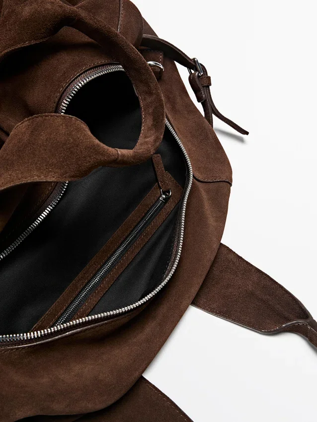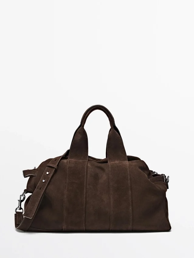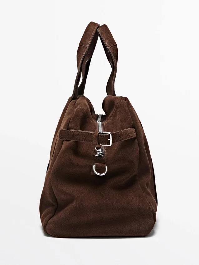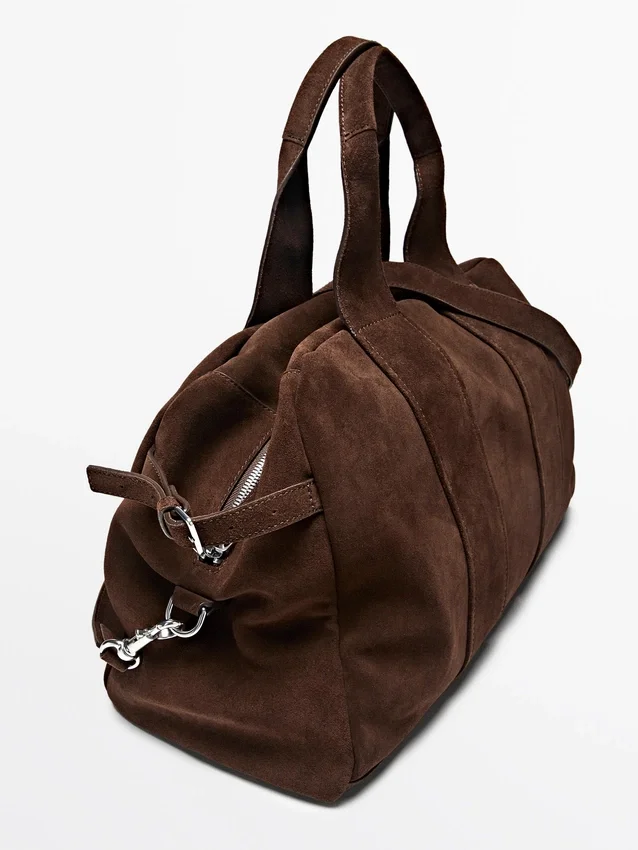 Borsa a mano in pelle bovina con finitura scamosciata. Chiusura con cerniera. Due manici e tracolla. Fodera in cotone.