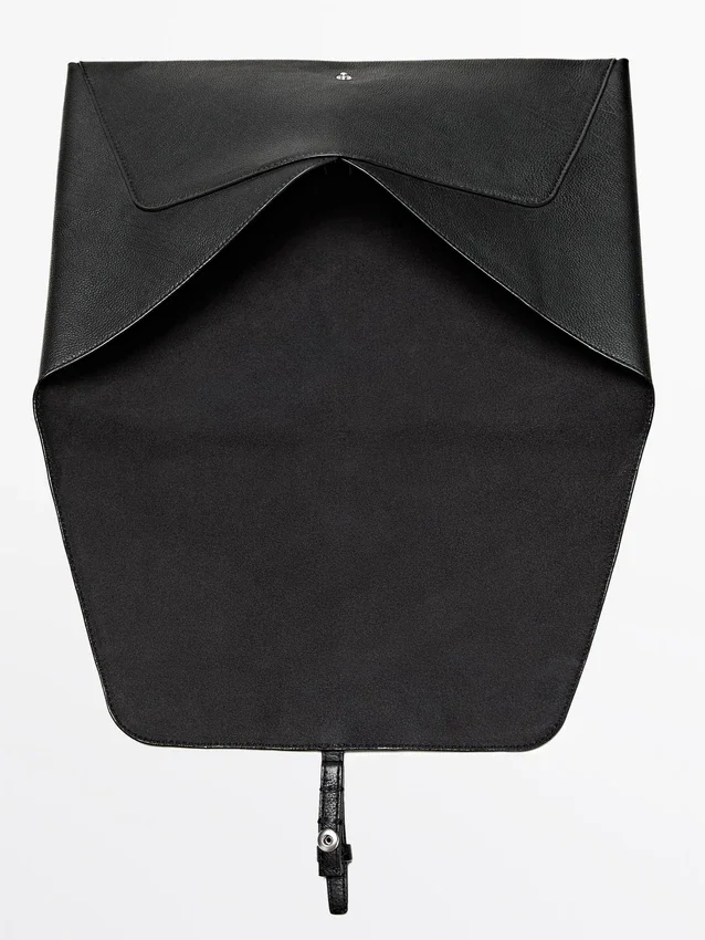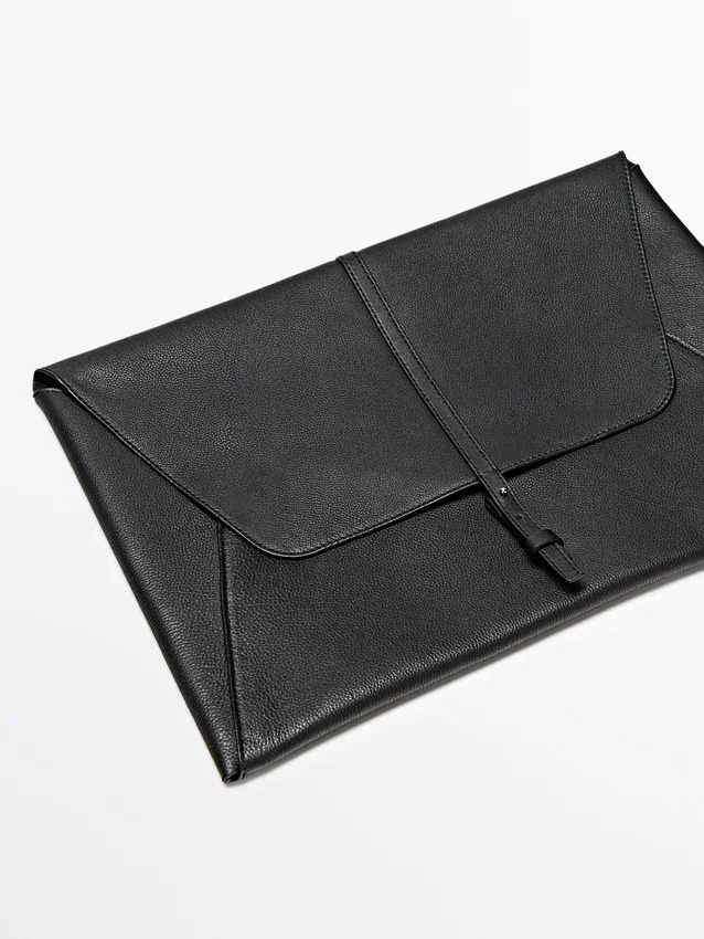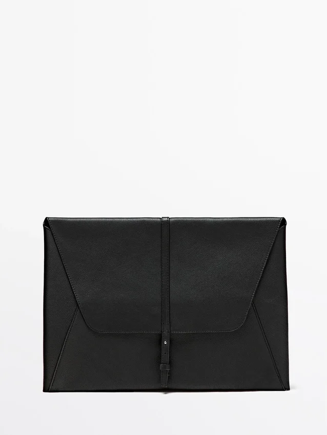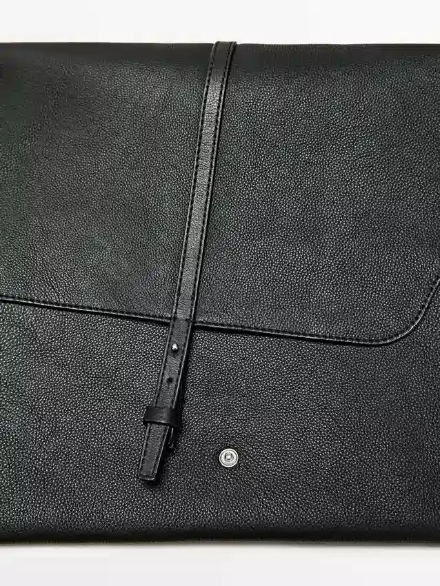 Custodia per laptop realizzata in pelle di vacchetta con finitura nappa. Chiusura a bottone a pressione nascosta.