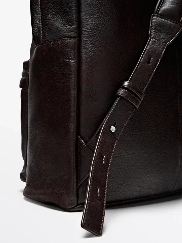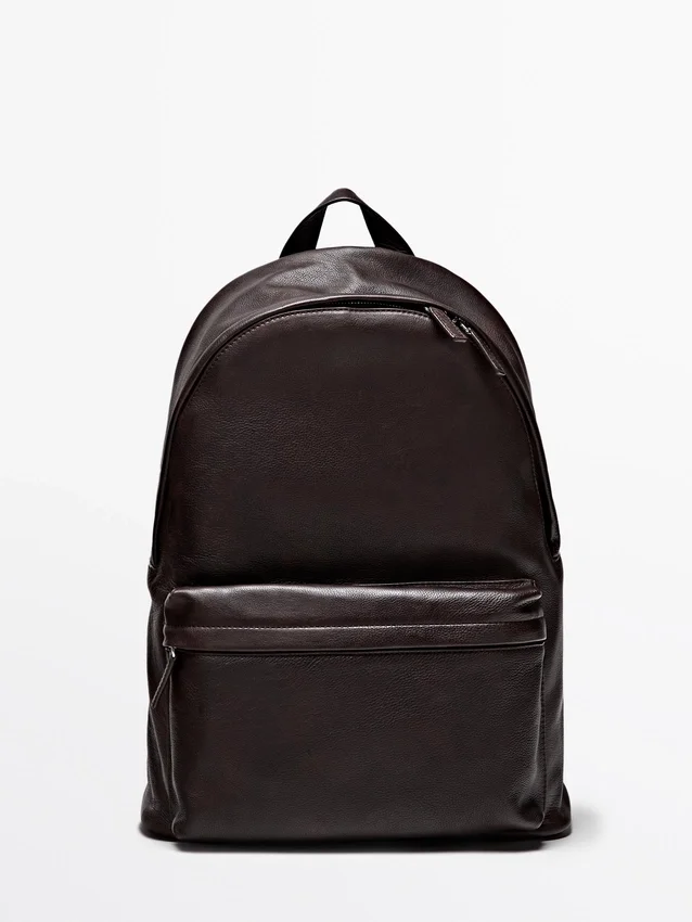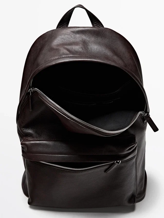 Zaino in pelle di vacchetta con finitura in pelle nappa. Chiusura con cerniera. Manico. Dotato di uno scomparto principale e di una tasca interna con cerniera. Fodera in cotone.