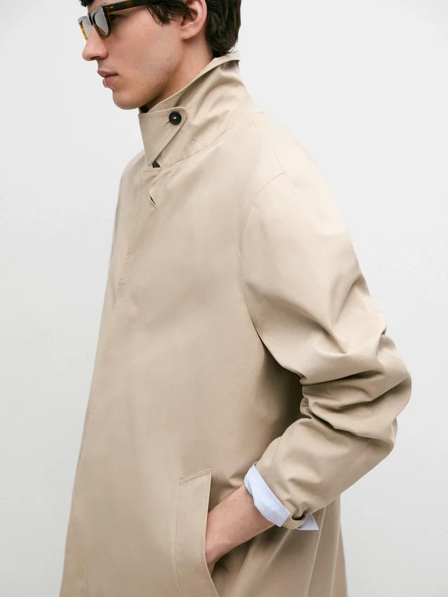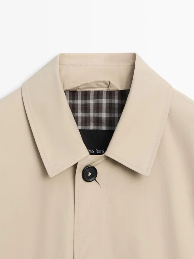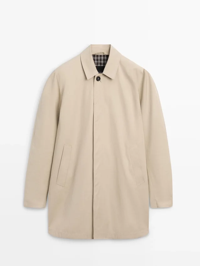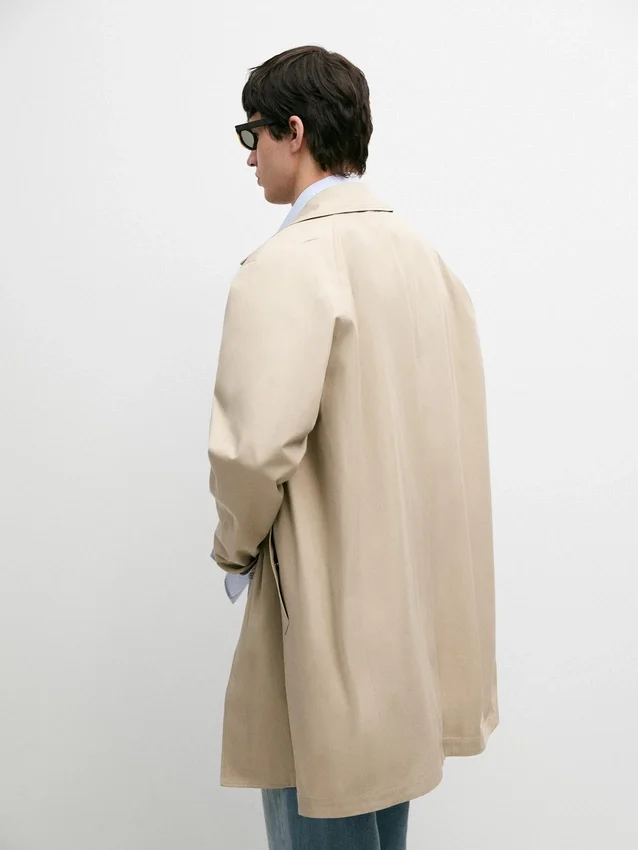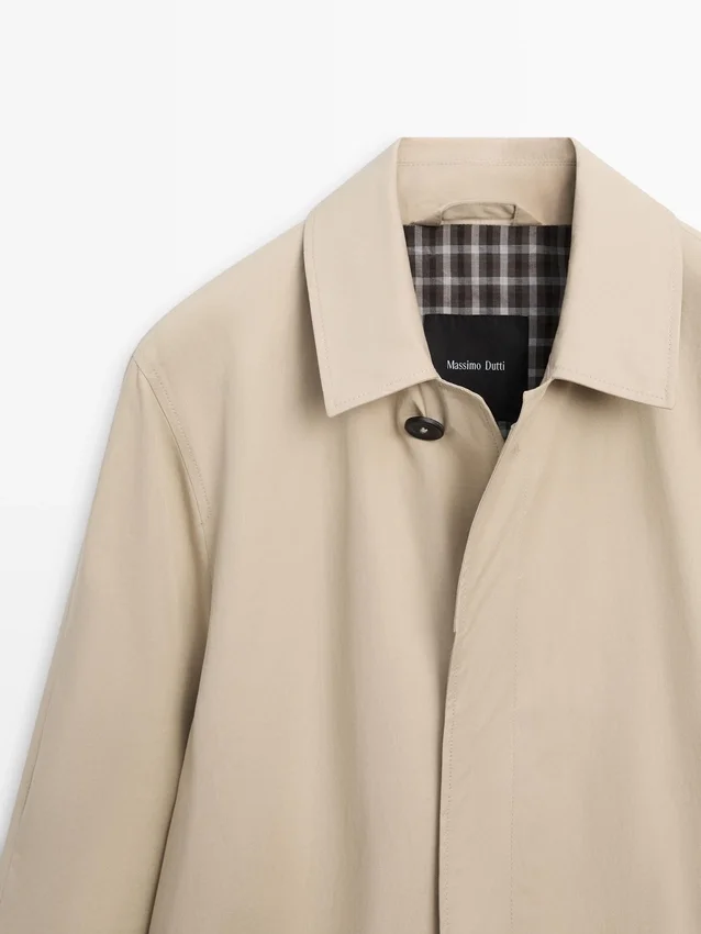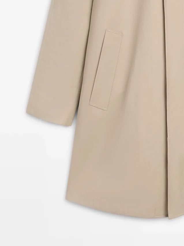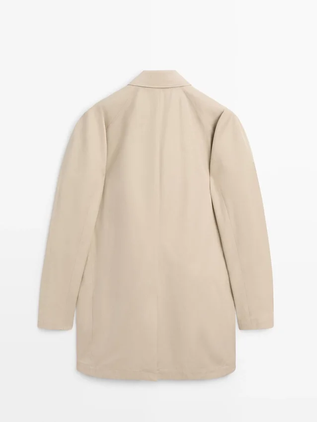 Trench realizzato con tessuto principale in cotone. Colletto a camicia. Maniche lunghe. Chiusura con bottoni nascosta da una patta e bottone. Due tasche laterali. Foderato.