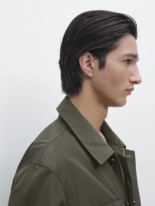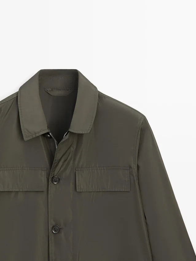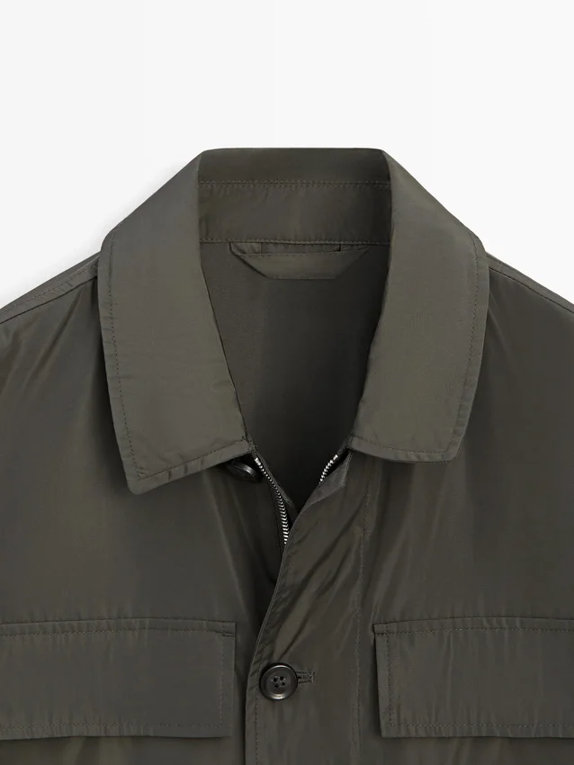 Giacca. Maniche lunghe con polsini abbottonati. Colletto a camicia. Chiusura con zip nascosta e abbottonatura. Due tasche applicate con patta. Due tasche applicate sul petto. Foderata.
