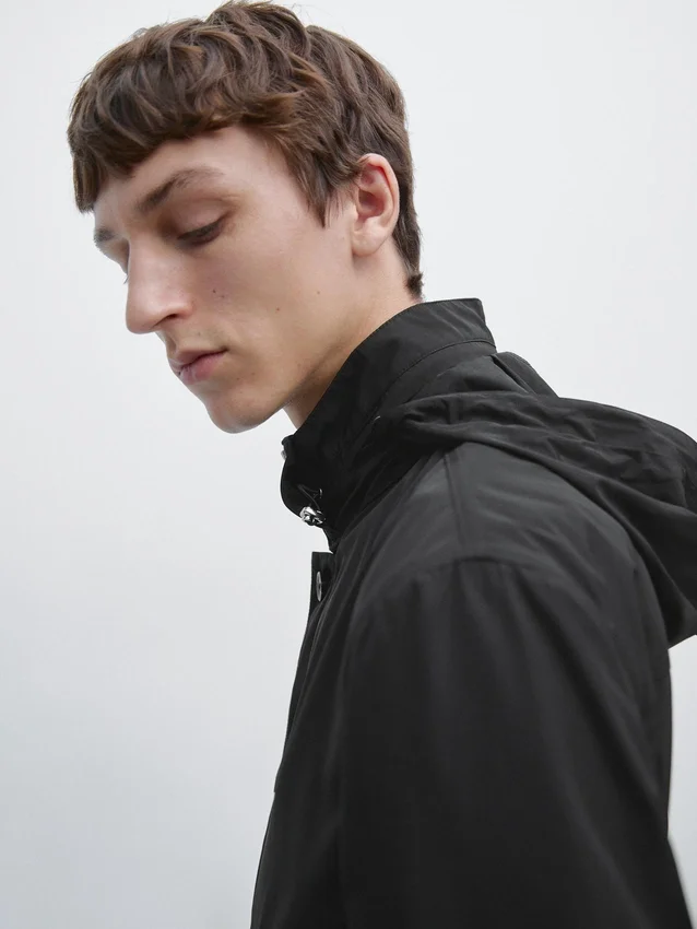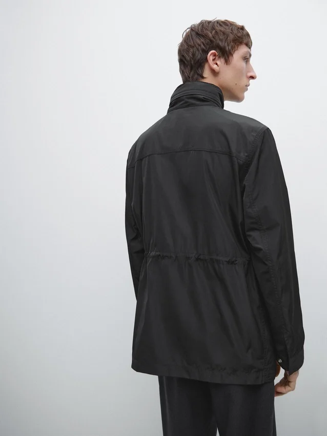 Parka. Chiusura frontale con bottoni. Cappuccio nascosto che può essere riposto dietro al collo. Cintura elastica regolabile. Due tasche laterali.Composizione