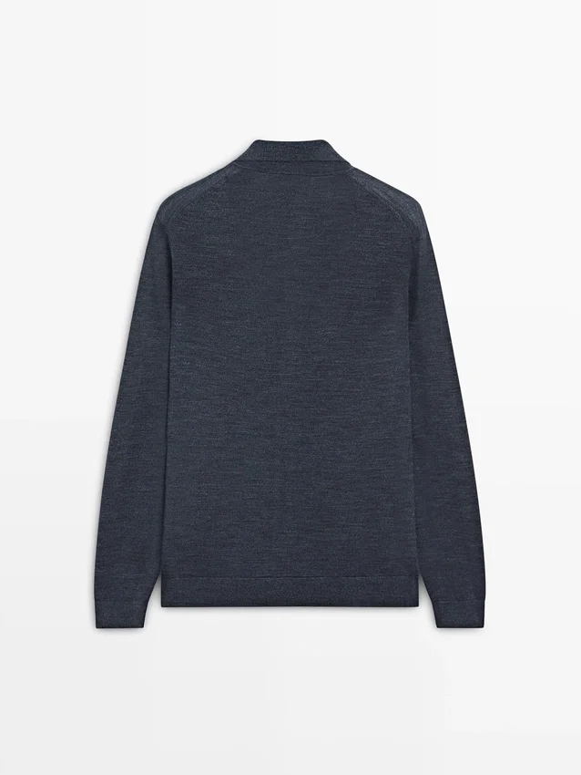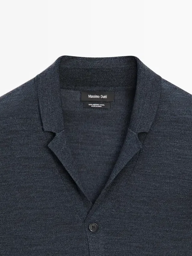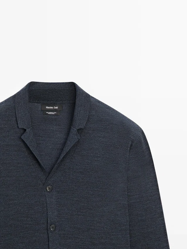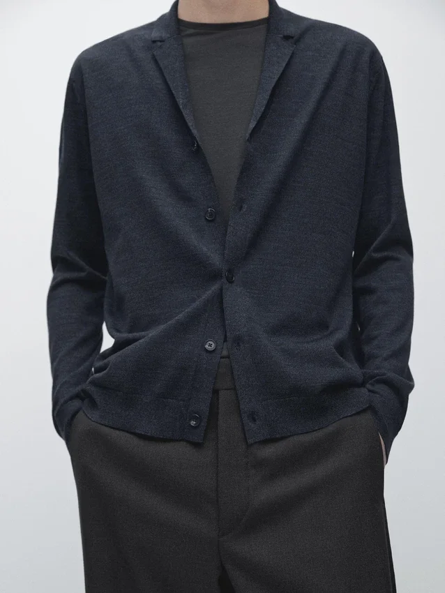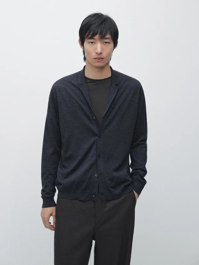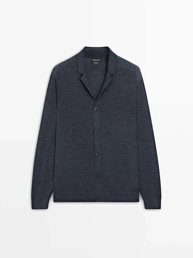 Cardigan realizzato in maglia di lana. Collo a revers. Maniche lunghe. Chiusura frontale con bottoni. Bordi a costine.
