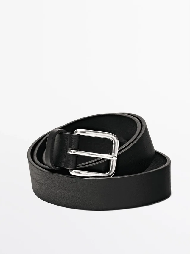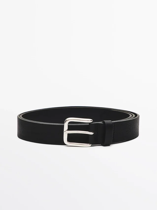 Cintura in pelle di vacchetta con finitura nappa. Larghezza 3 cm. Fibbia quadrata in metallo.