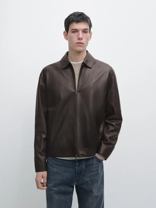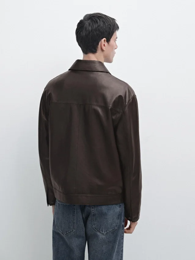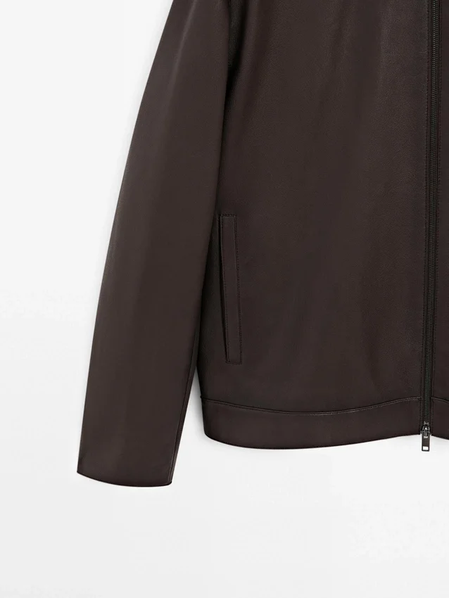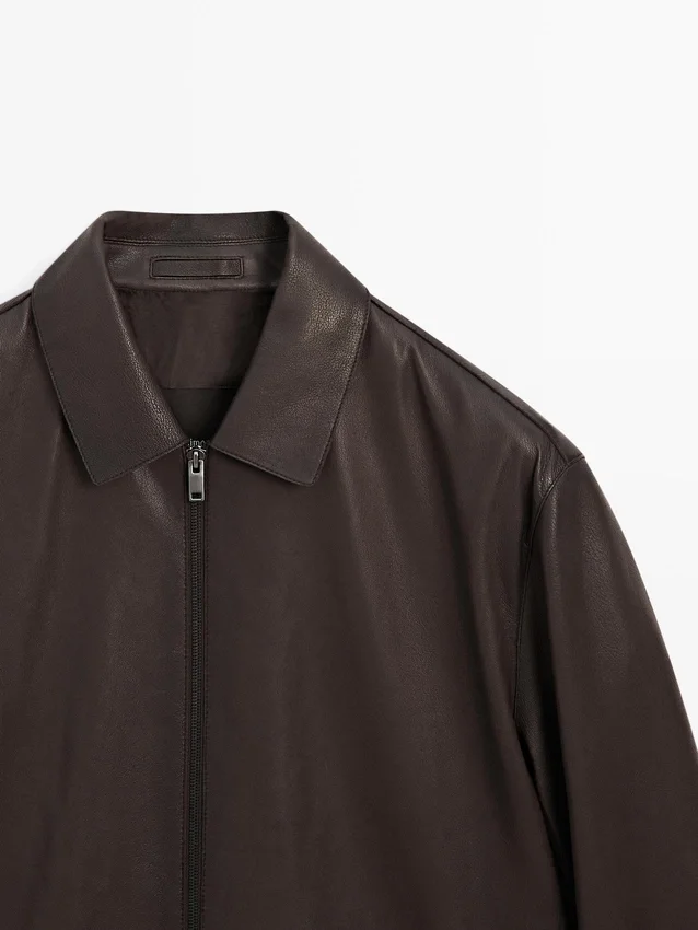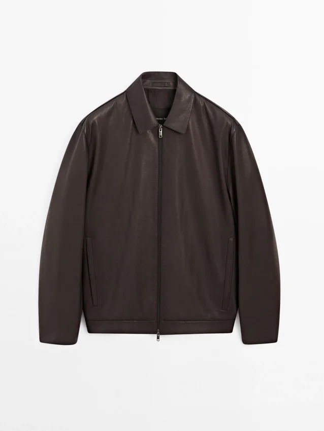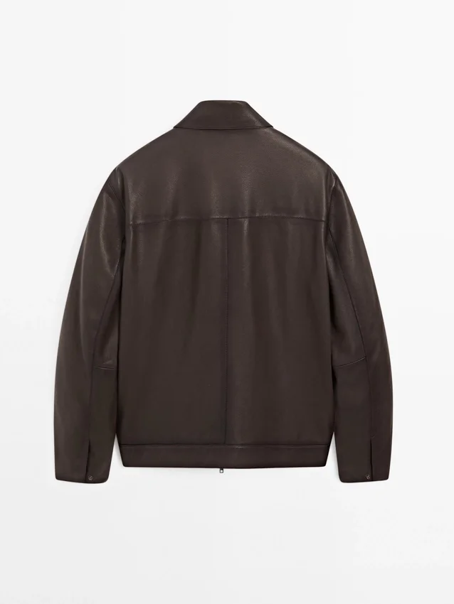 Giacca in pelle di montone con finitura nappa. Colletto a camicia. Maniche lunghe con polsini a bottoni automatici. Chiusura con cerniera a doppio cursore. Due tasche laterali.