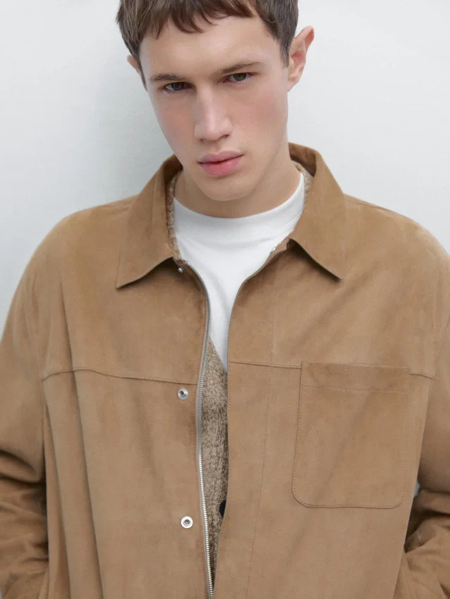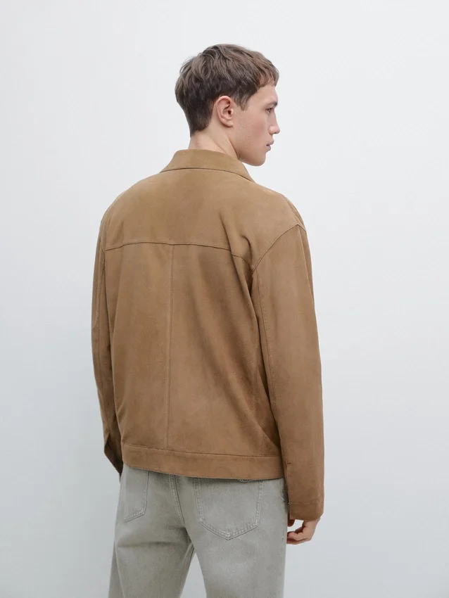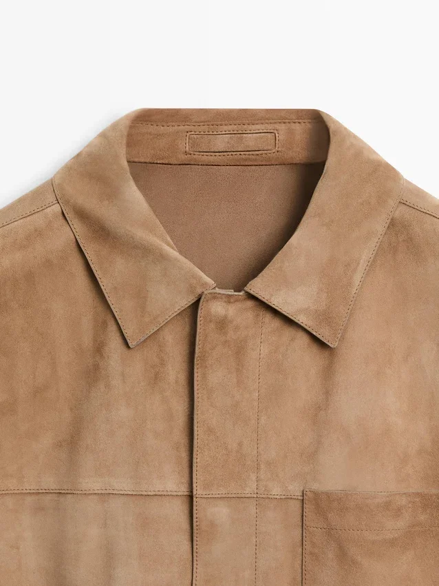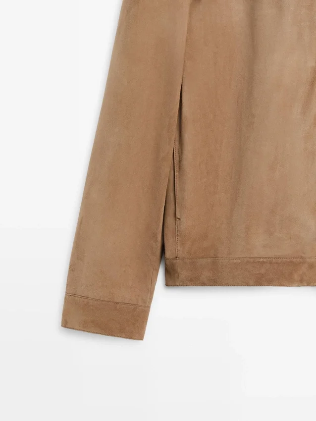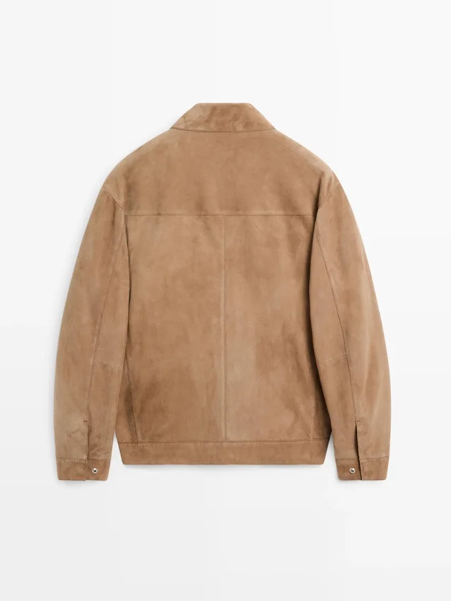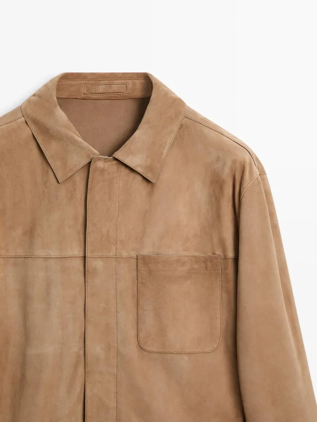 Giacca in pelle di capra con finitura scamosciata. Colletto a camicia. Chiusura con cerniera nascosta e abbottonatura. Tasca applicata sul petto. Foderata.
