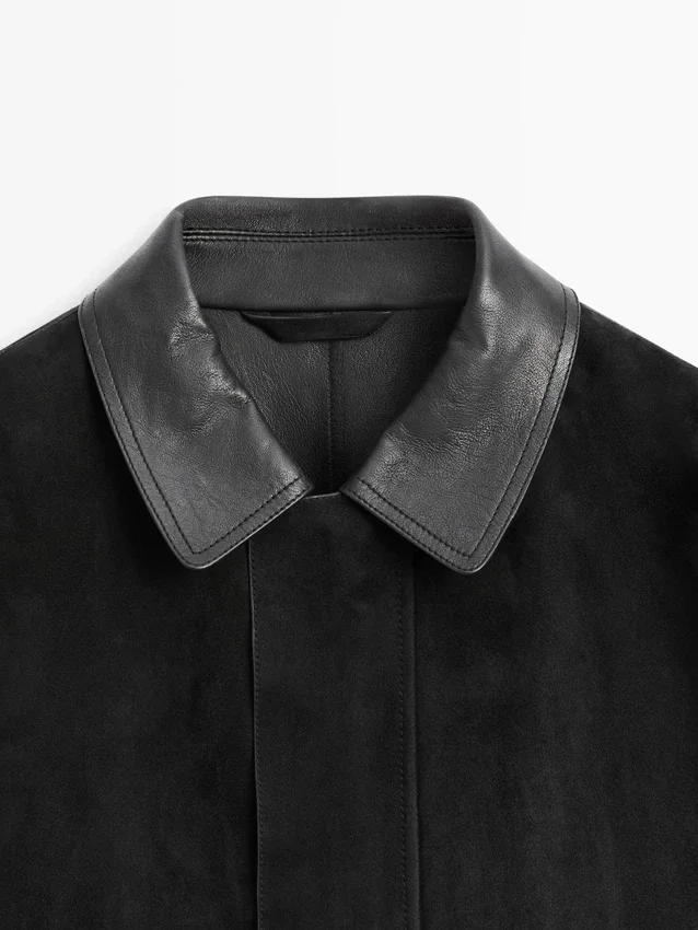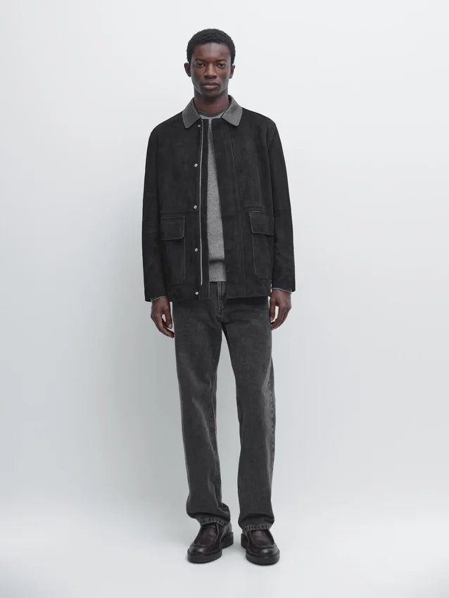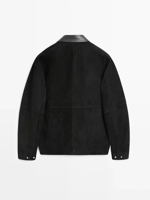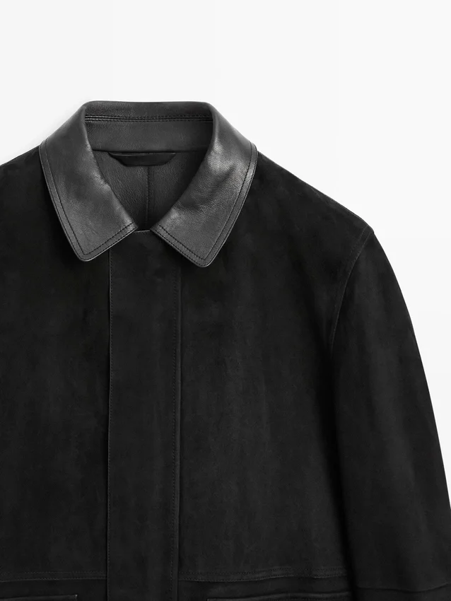 Giacca realizzata in pelle di pecora con finitura in pelle scamosciata. Collo a camicia. Maniche lunghe. Due tasche con patta.