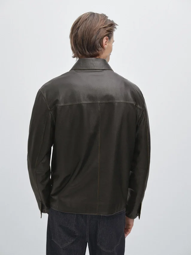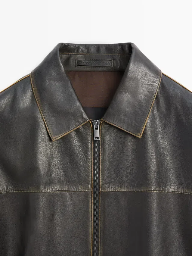 Giacca in pelle con finitura nappa. Colletto a camicia. Chiusura con zip a doppio cursore. Tasca interna con bottoni a pressione. Tasche laterali con chiusura a bottoni a pressione. Foderata. Dettagli cuciture. Effetto consumato.