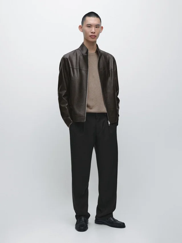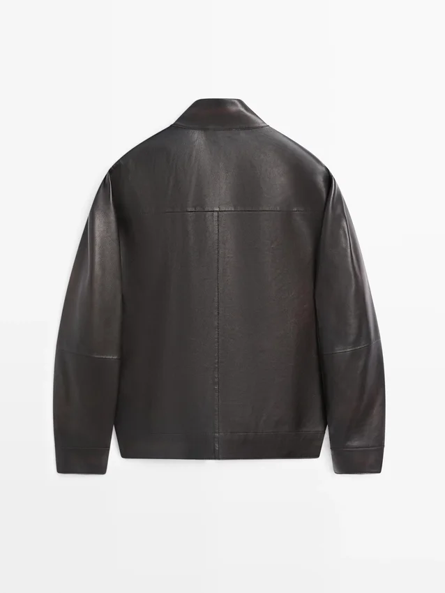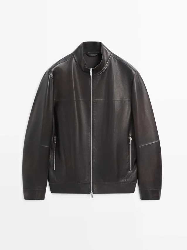 Giacca in pelle di montone con finitura nappa. Chiusura con cerniera a doppio cursore. Collo alto. Due tasche laterali. Dettagli cuciture.
