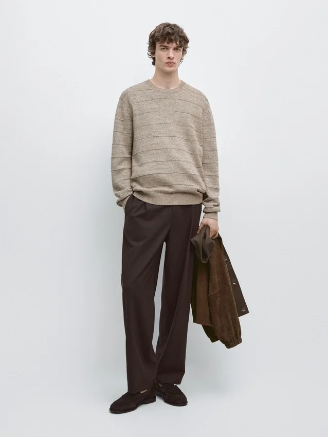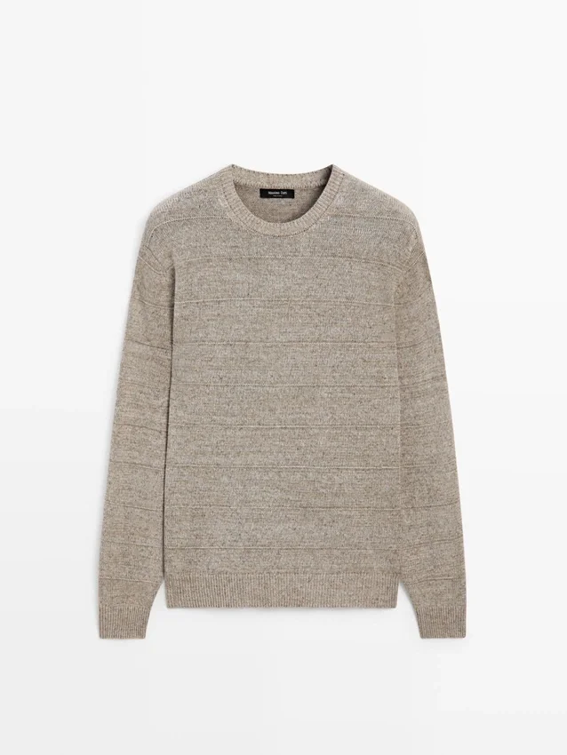 Maglione in maglia mista cotone. Girocollo. Maniche lunghe. Bordi a costine. Dettagli a righe.