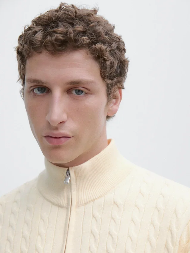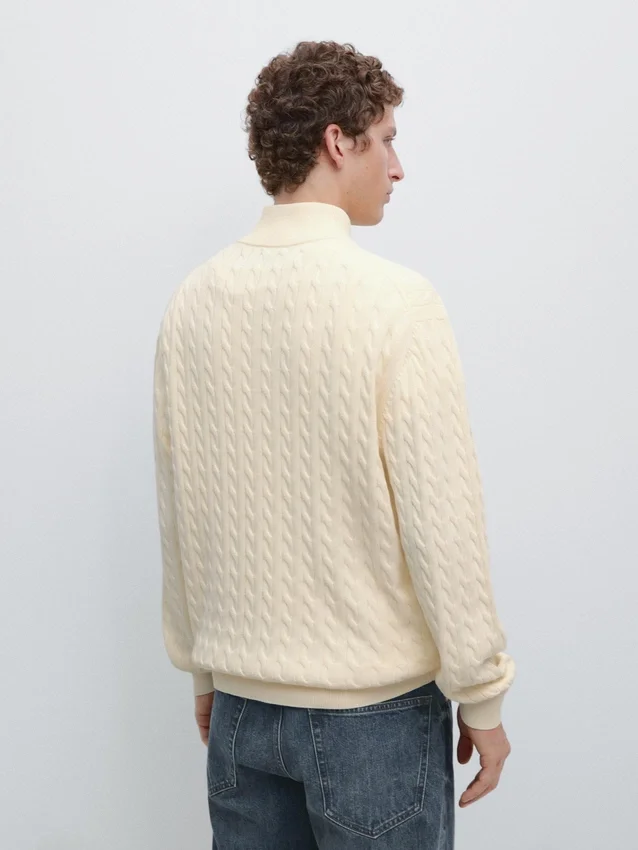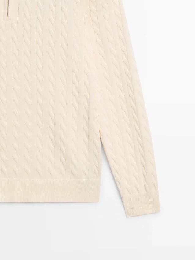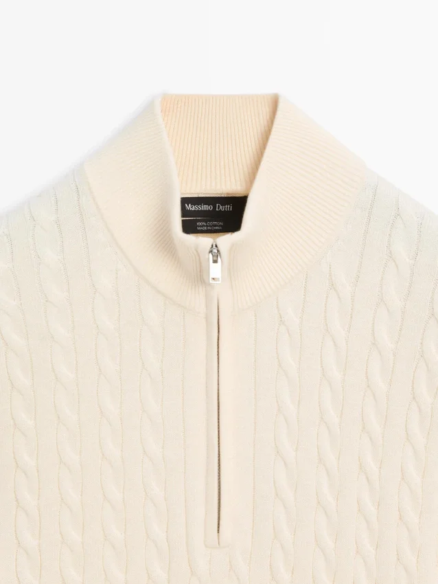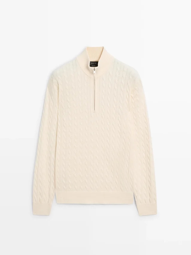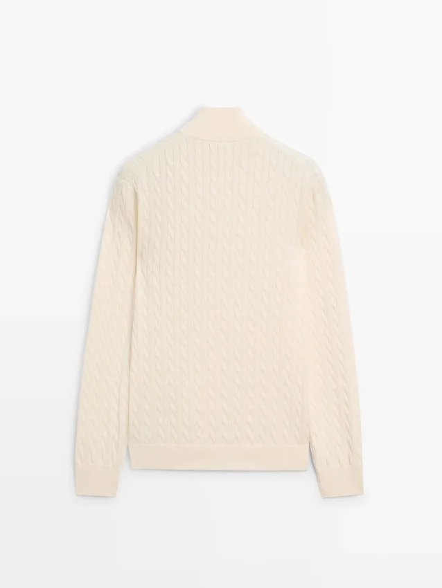 Maglione in maglia realizzato in tessuto di cotone. Maniche lunghe. Collo alto con zip. Bordi a costine. Dettaglio intrecciato.