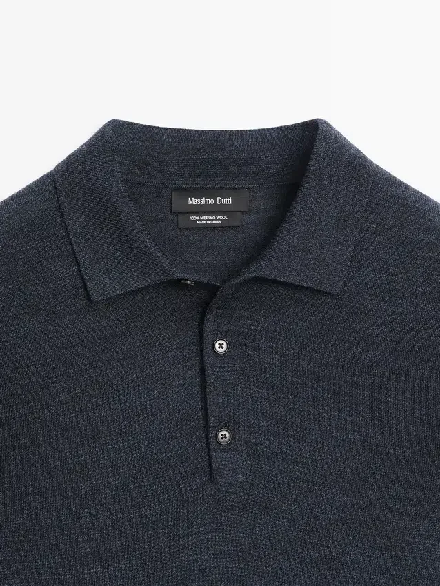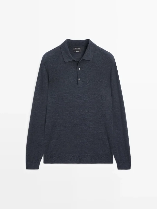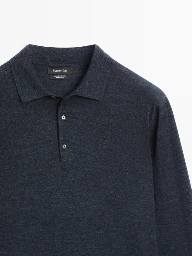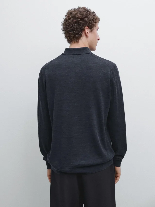 Maglione in maglia di lana. Maniche lunghe. Collo a Polo con chiusura a bottoni. Bordi a costine.