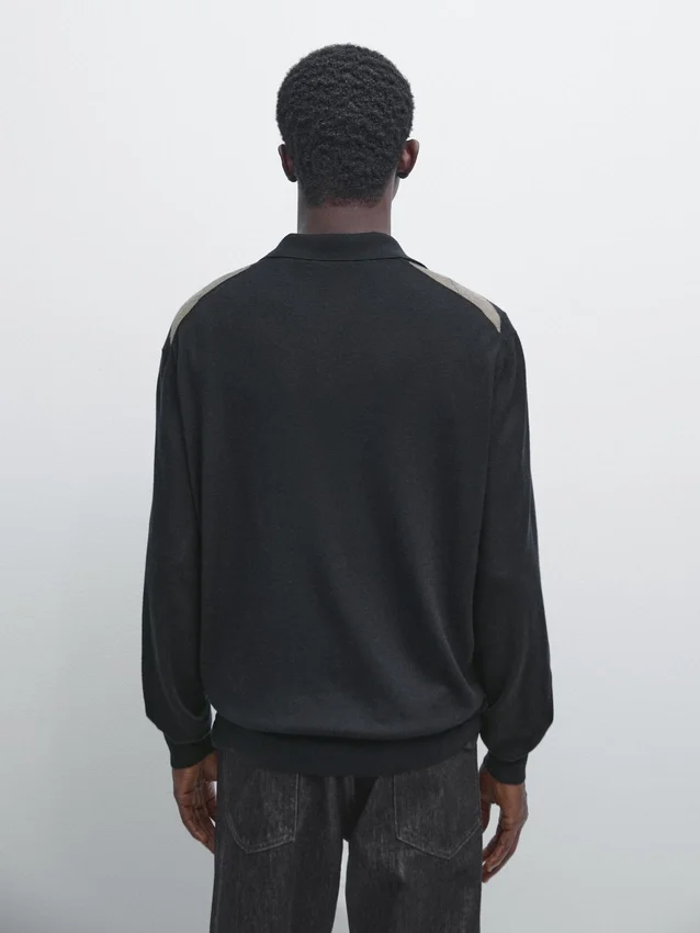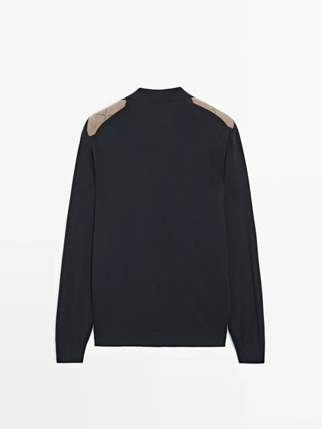 Maglione in maglia mista lana. Collo Johnny. Maniche lunghe. Dettagli a rombi. Bordi a costine.