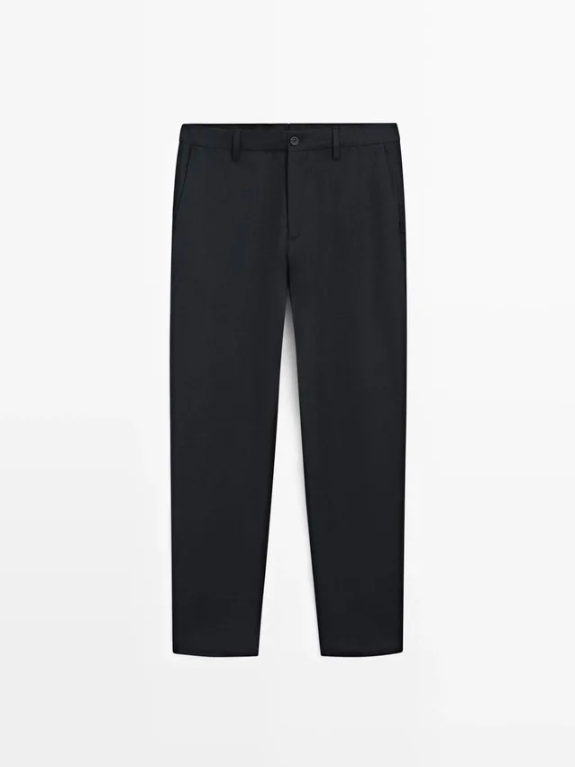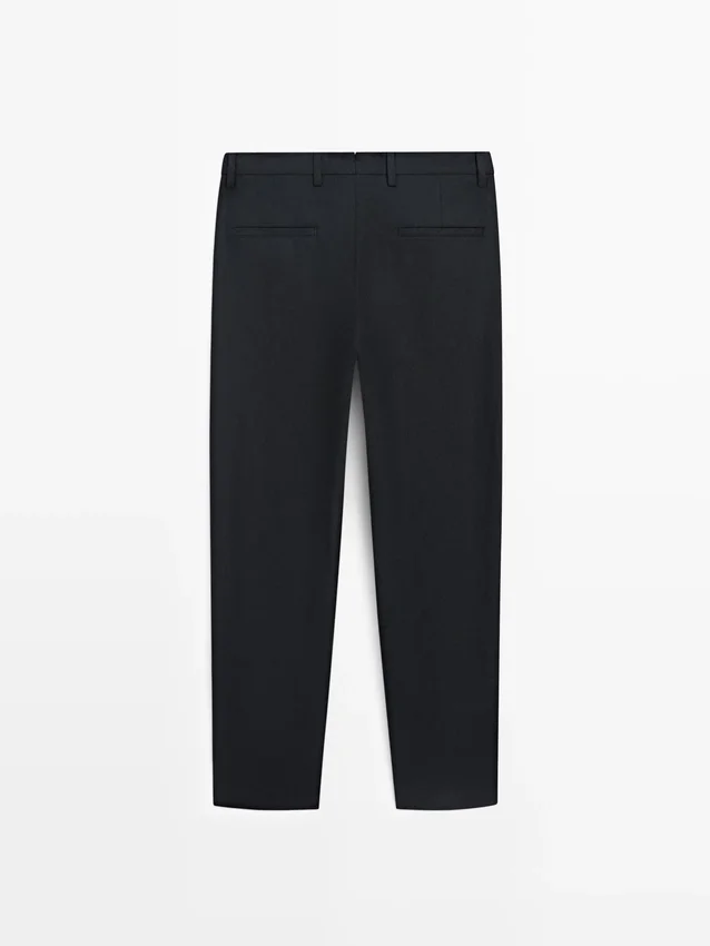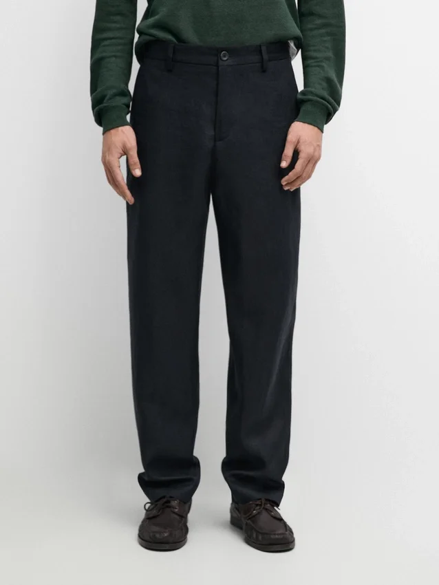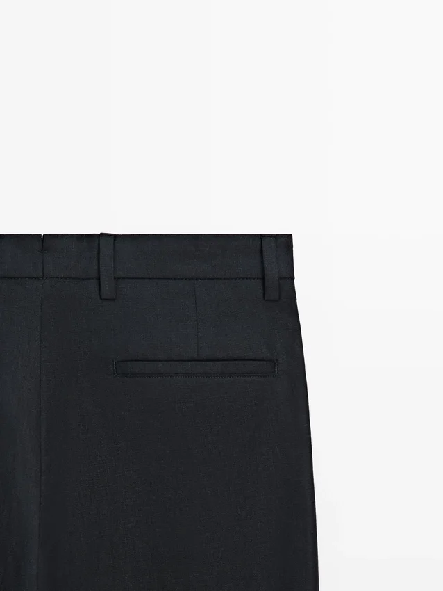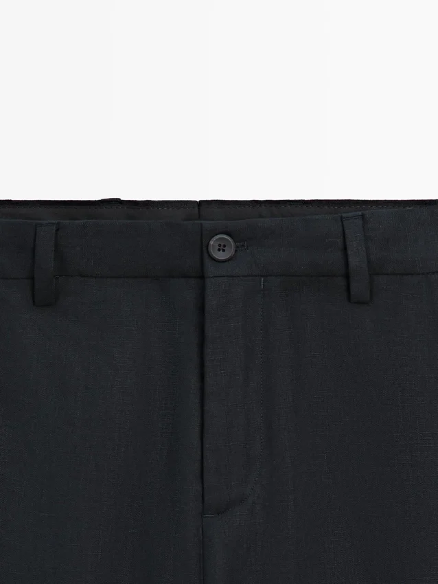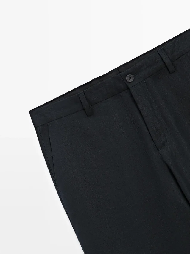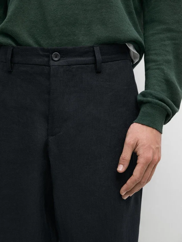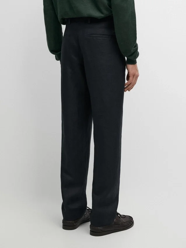 Pantaloni da completo realizzati in tessuto principale di lino. Chiusura con cerniera nascosta da una patta, bottone e cinturino abbottonato. Due tasche laterali. Questo capo fa parte di un abito da uomo.