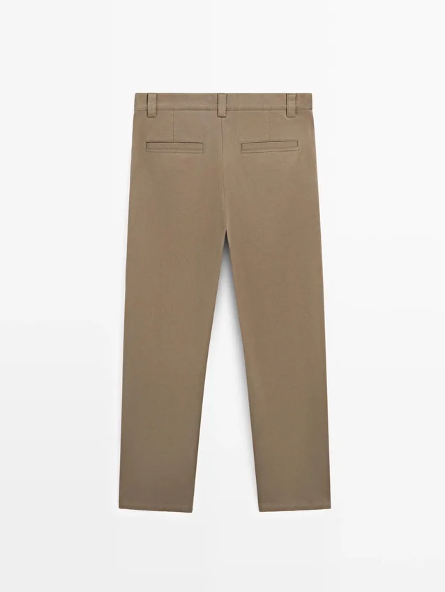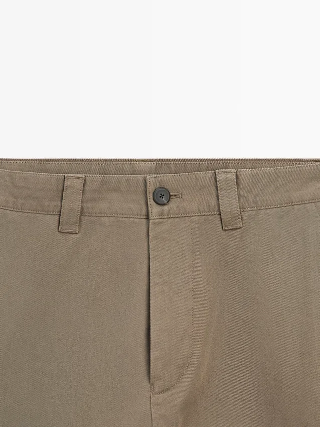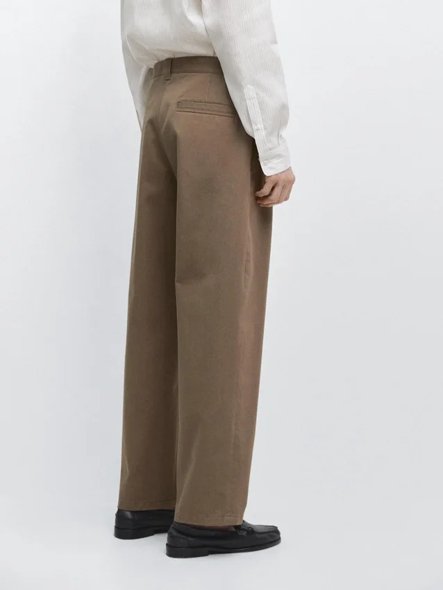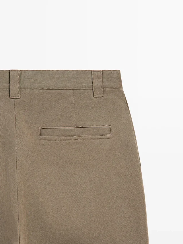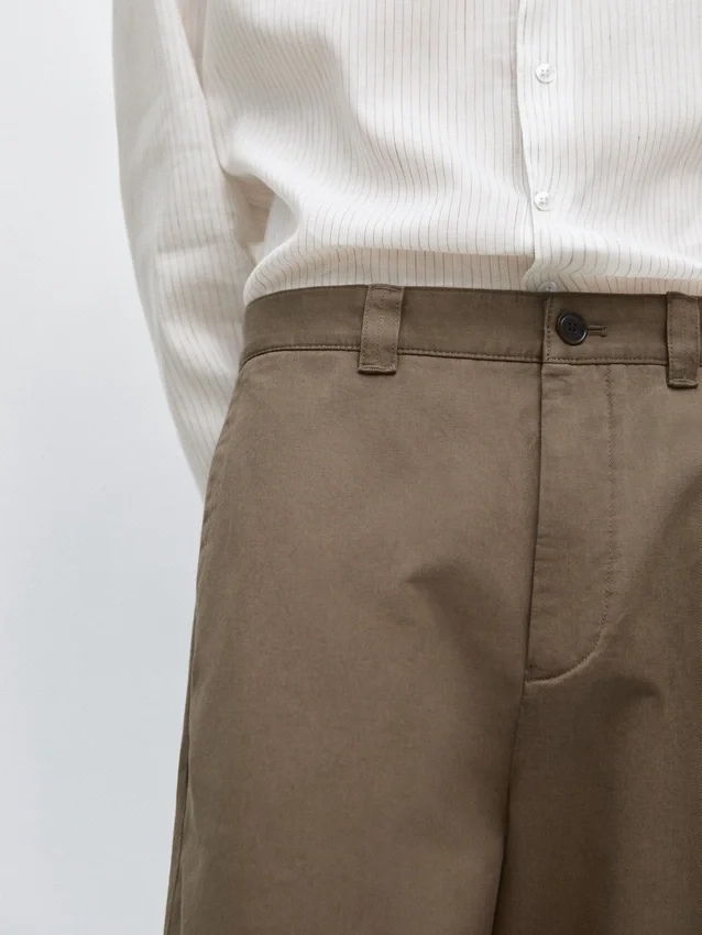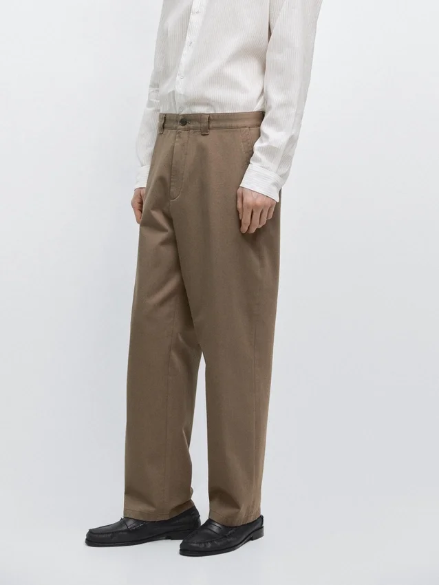 Pantaloni dalla vestibilità comoda: questo modello presenta una linea ampia e morbida in vita, sui fianchi e sulle gambe. Pantaloni realizzati in tessuto di cotone. Chiusura frontale con cerniera e bottone superiore. Due tasche laterali.