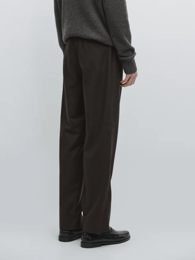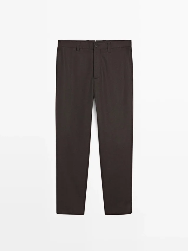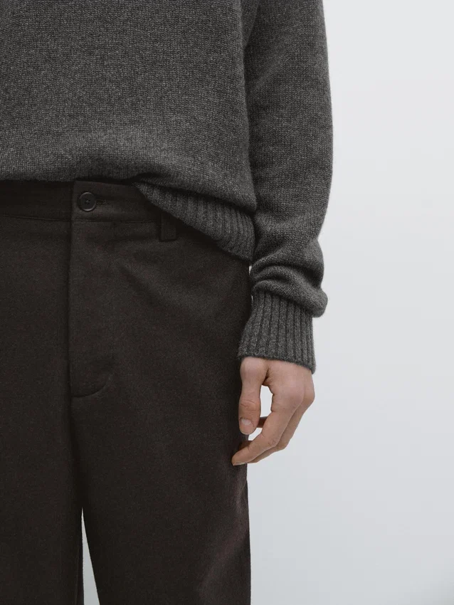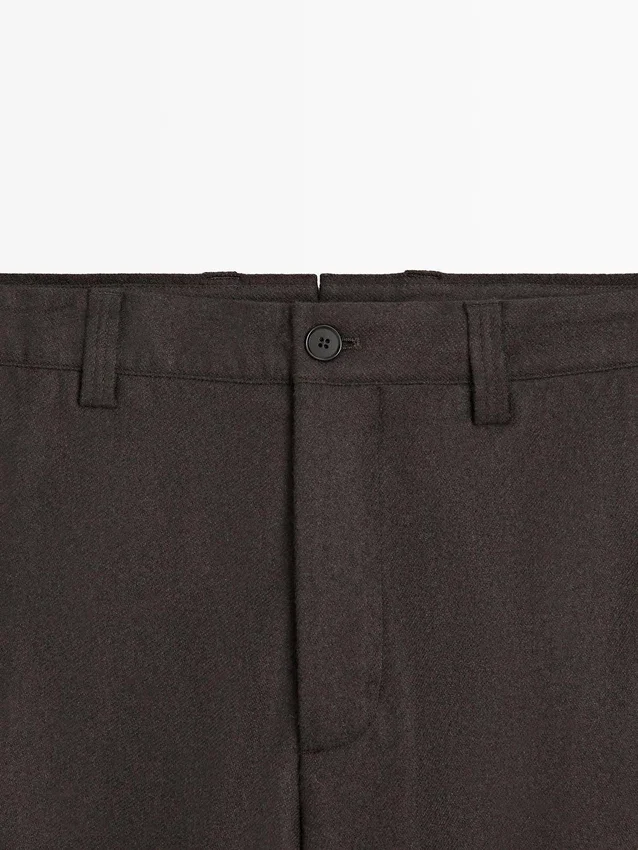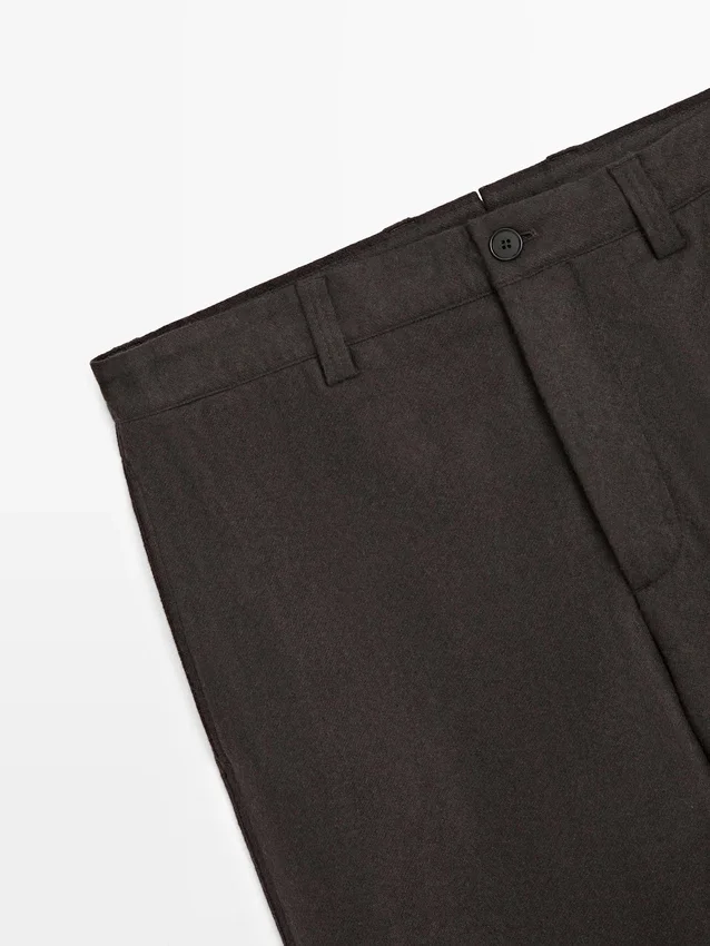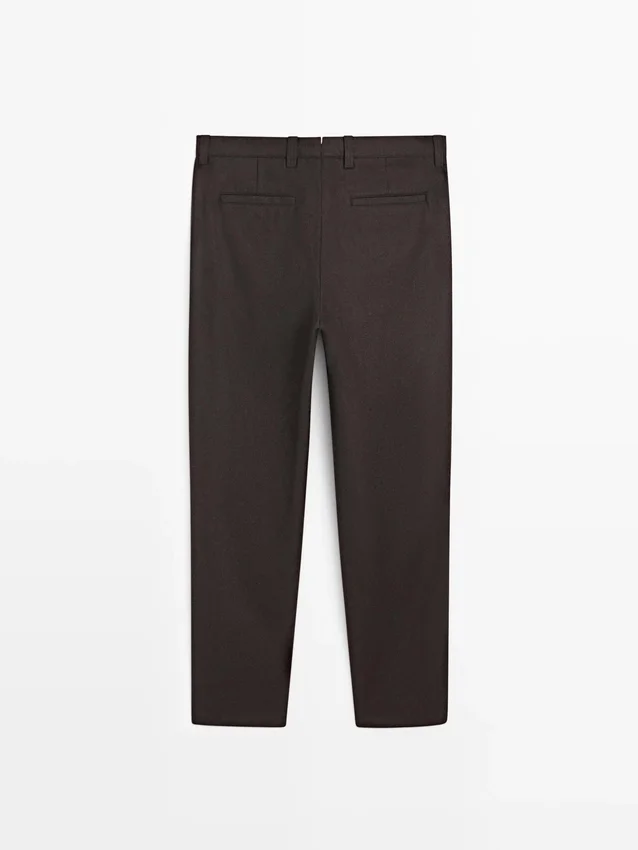 Pantaloni realizzati in tessuto misto lana. Cintura con passanti. Chiusura con zip nascosta con patta, bottone e bottone interno. Due tasche laterali. Due tasche a filetto sul retro. Indumento coordinato disponibile.